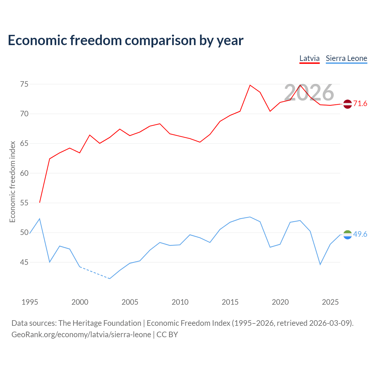 The Economic Freedom Index for Latvia is 71.6, ranking 31/197, compared to 49.6 for Sierra Leone, ranking 165/197. The chart above displays a comparison of annual changes in economic freedom indexes.
