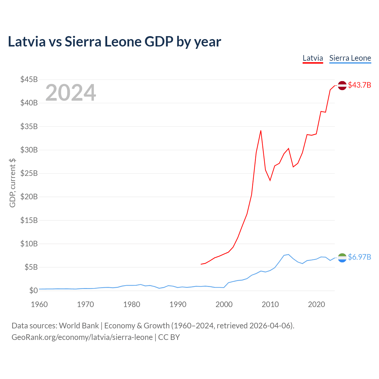 Latvia has a GDP of $43.7B compared to $6.97B for Sierra Leone, ranking 99/197 and 160/197 by economy size, respectively.