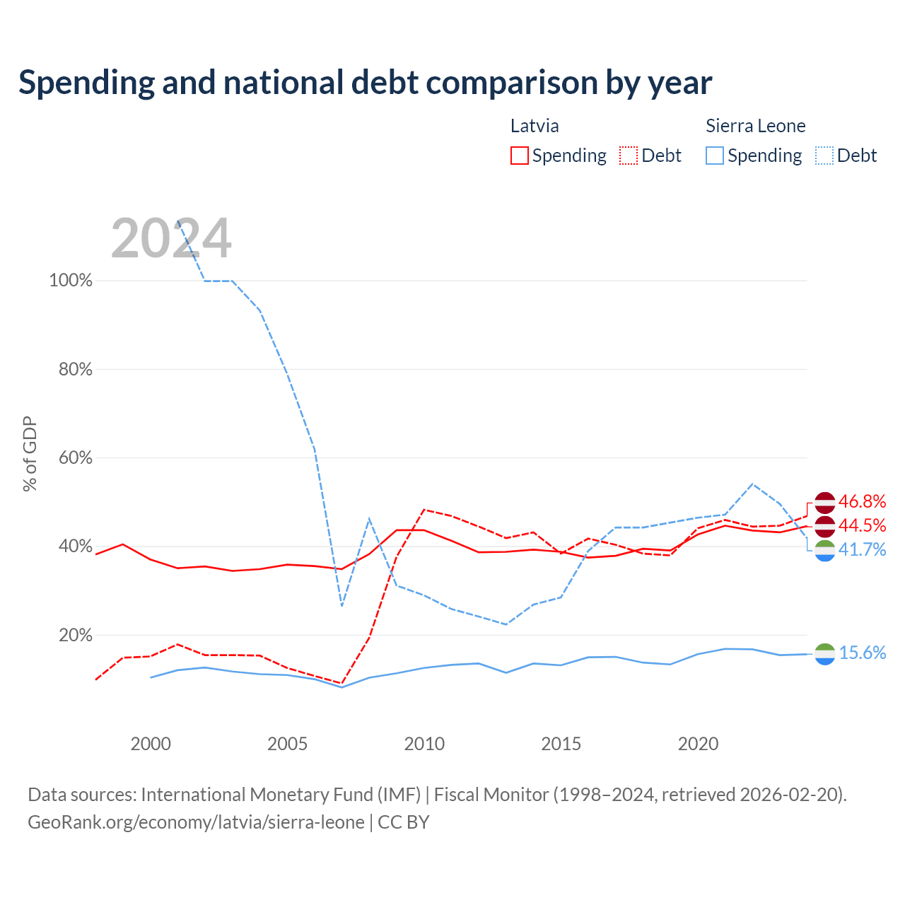 Latvia has $20.4B in government debt (46.8% of GDP), compared to $2.91B (41.7% of GDP) in Sierra Leone.