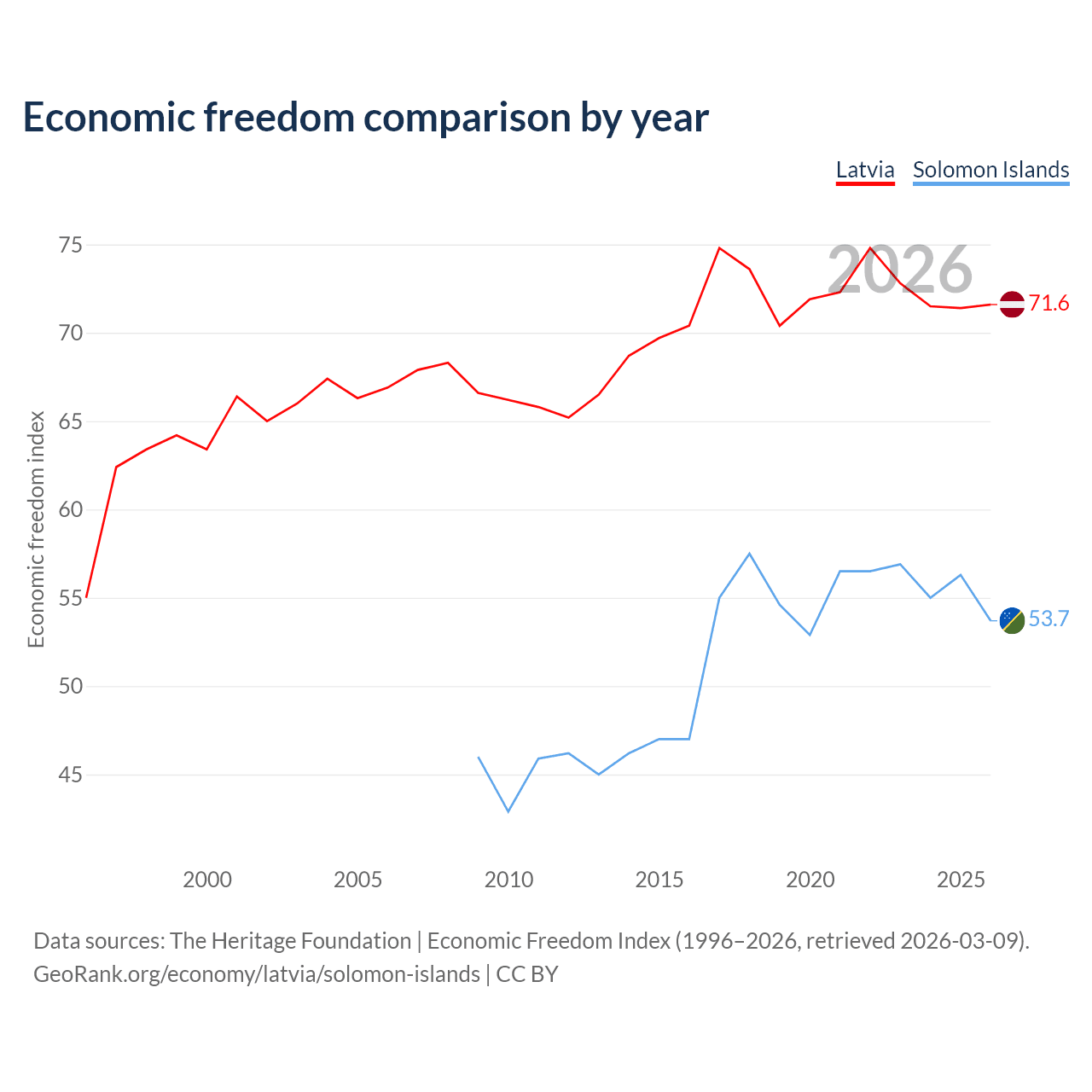 The Economic Freedom Index for Latvia is 71.6, ranking 31/197, compared to 53.7 for the Solomon Islands, ranking 137/197. The chart above displays a comparison of annual changes in economic freedom indexes.