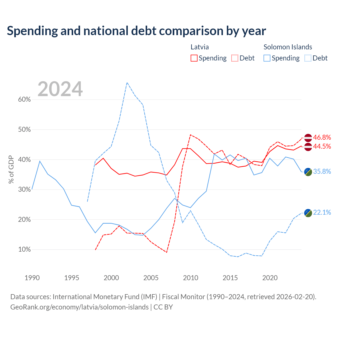 Latvia has $20.4B in government debt (46.8% of GDP), compared to $350M (22.1% of GDP) in the Solomon Islands.