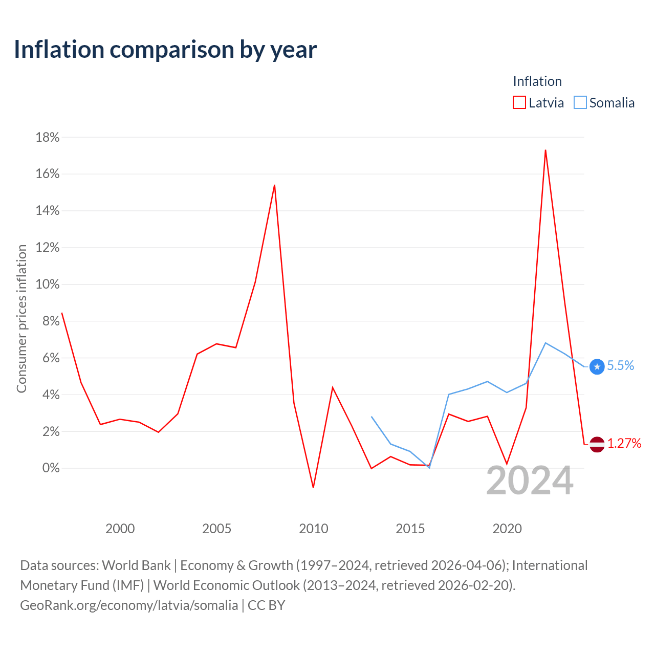Over the past 12 years, Latvia has recorded an average annual inflation rate of 3.35%, compared with 3.77% in Somalia. In 2024, inflation was 1.27% in Latvia and 5.5% in Somalia.