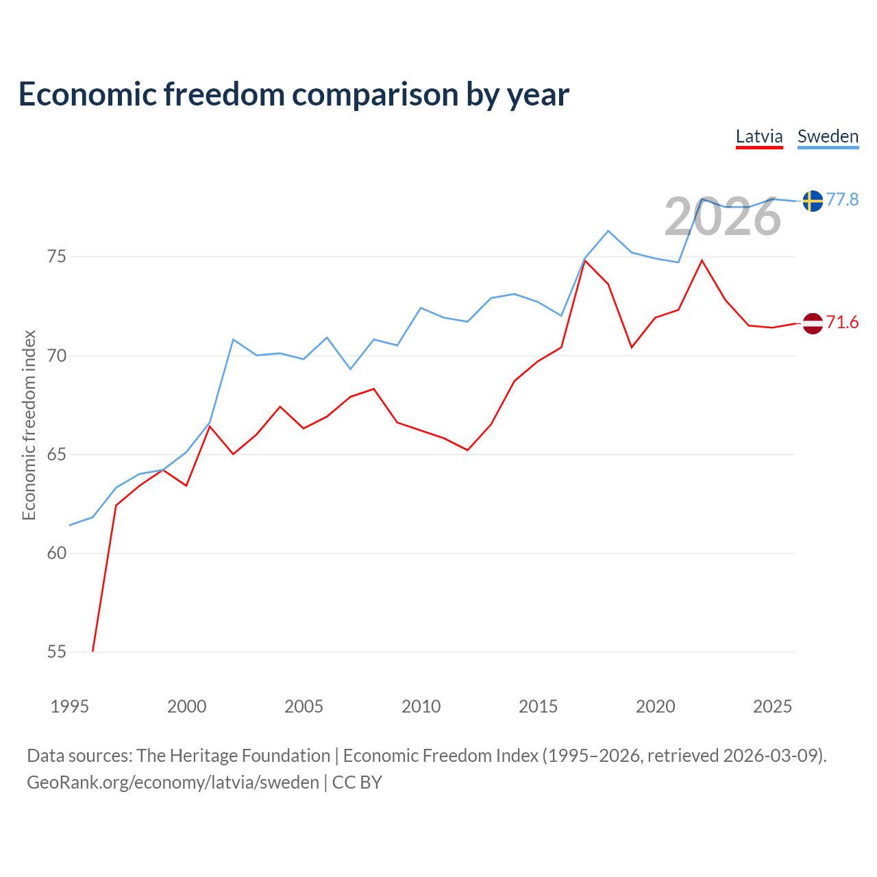 The Economic Freedom Index for Latvia is 71.6, ranking 31/197, compared to 77.8 for Sweden, ranking 14/197. The chart above displays a comparison of annual changes in economic freedom indexes.