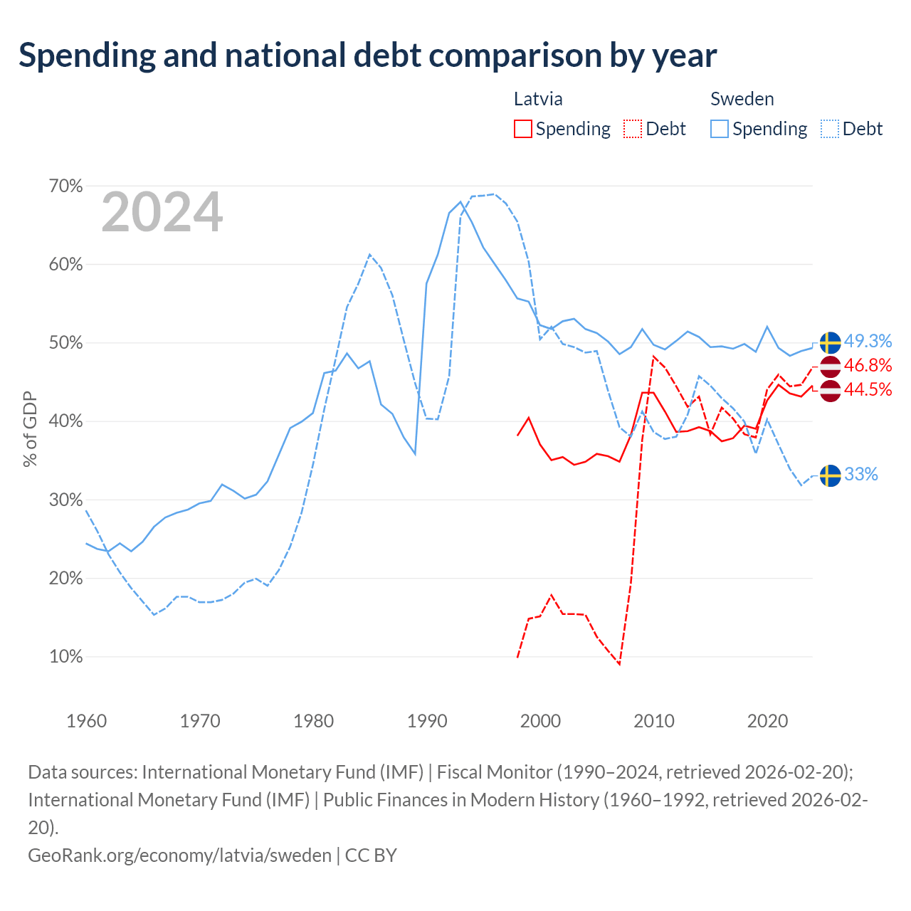 Latvia has $20.4B in government debt (46.8% of GDP), compared to $199B (33% of GDP) in Sweden.