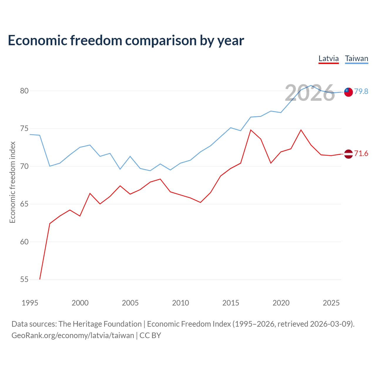 The Economic Freedom Index for Latvia is 71.6, ranking 31/197, compared to 79.8 for Taiwan, ranking 6/197. The chart above displays a comparison of annual changes in economic freedom indexes.