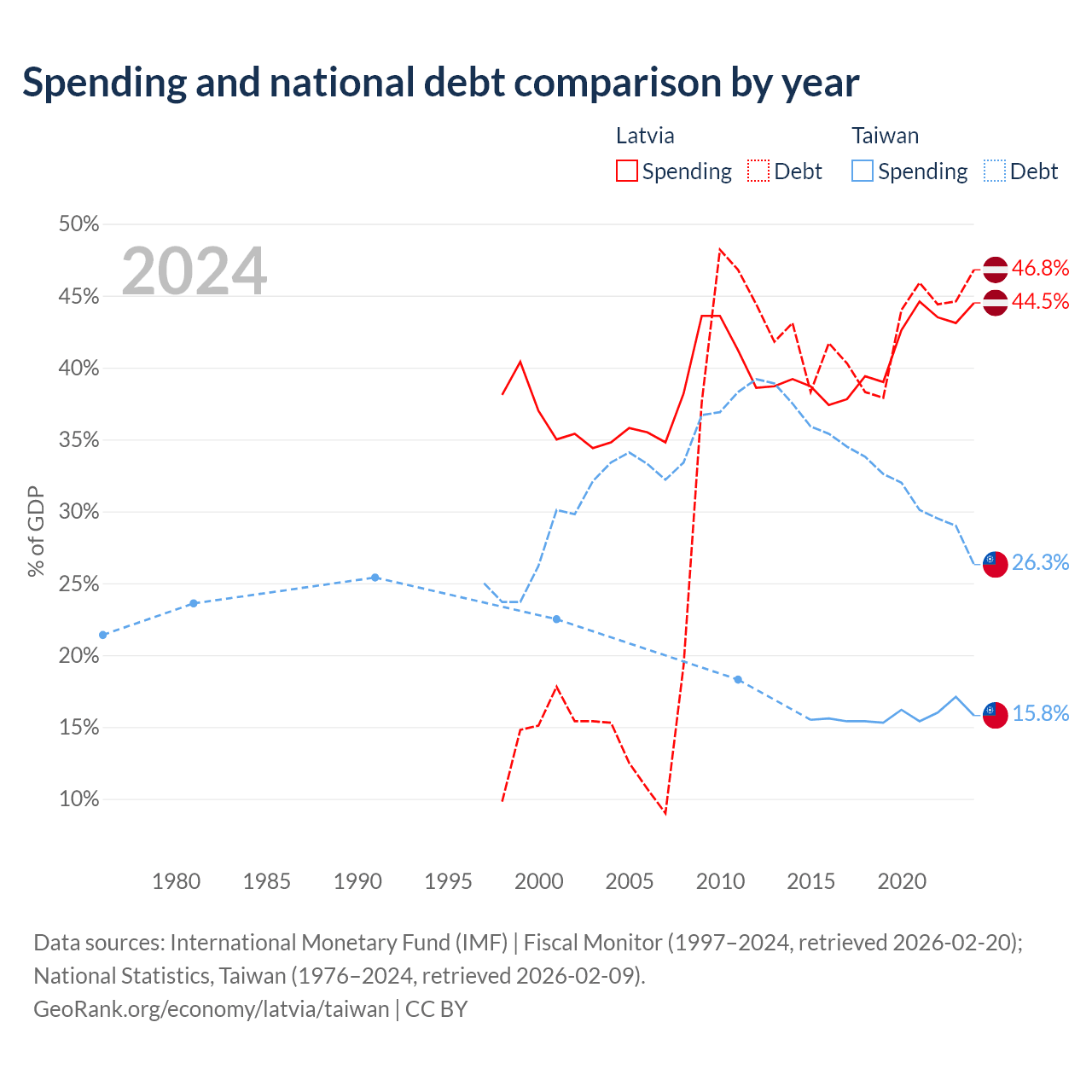 Latvia has $20.4B in government debt (46.8% of GDP), compared to $211B (26.3% of GDP) in Taiwan.
