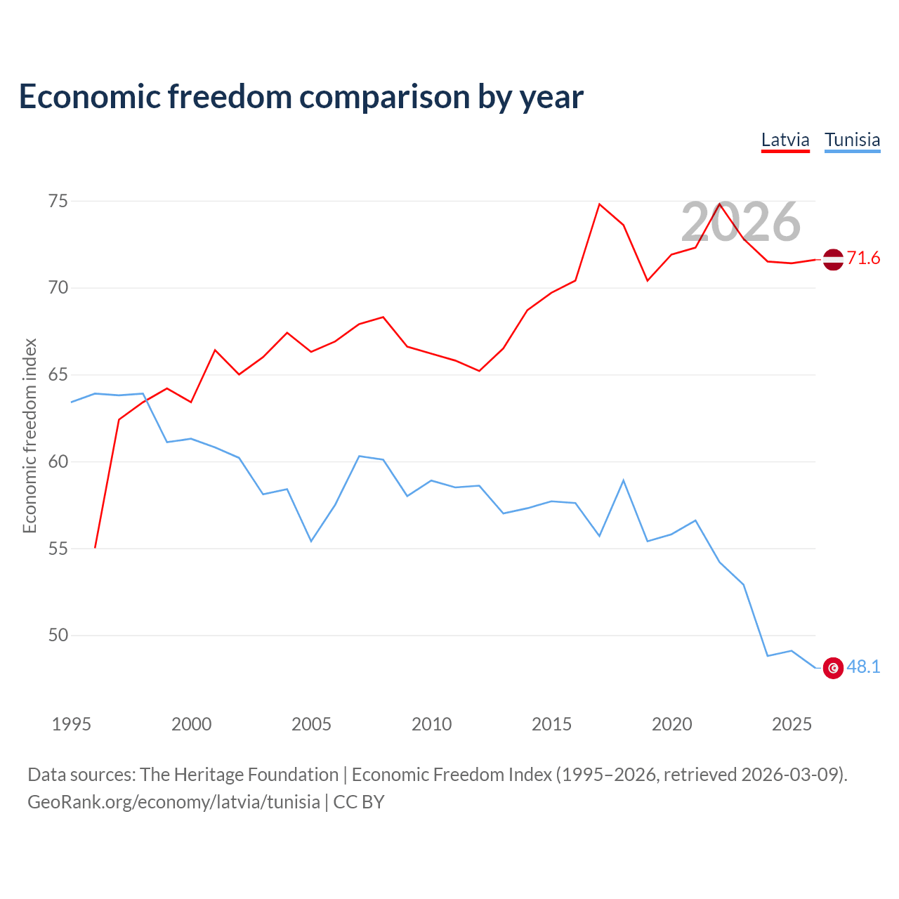 The Economic Freedom Index for Latvia is 71.6, ranking 31/197, compared to 48.1 for Tunisia, ranking 172/197. The chart above displays a comparison of annual changes in economic freedom indexes.