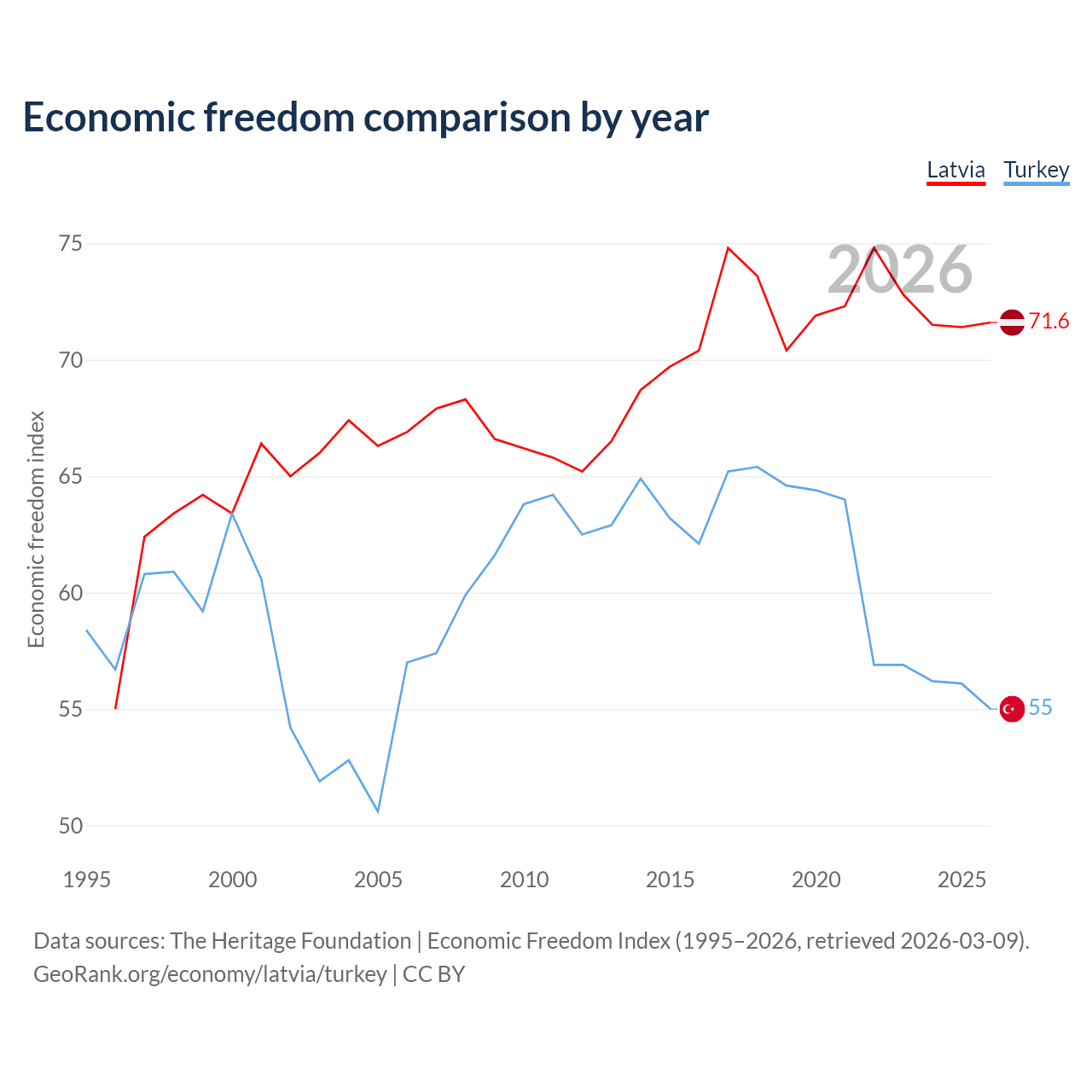 The Economic Freedom Index for Latvia is 71.6, ranking 31/197, compared to 55 for Turkey, ranking 129/197. The chart above displays a comparison of annual changes in economic freedom indexes.