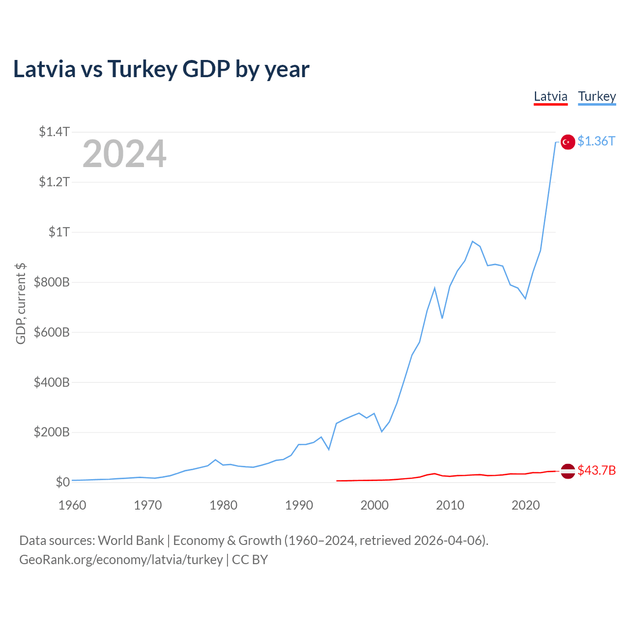 Latvia vs Turkey GDP by year