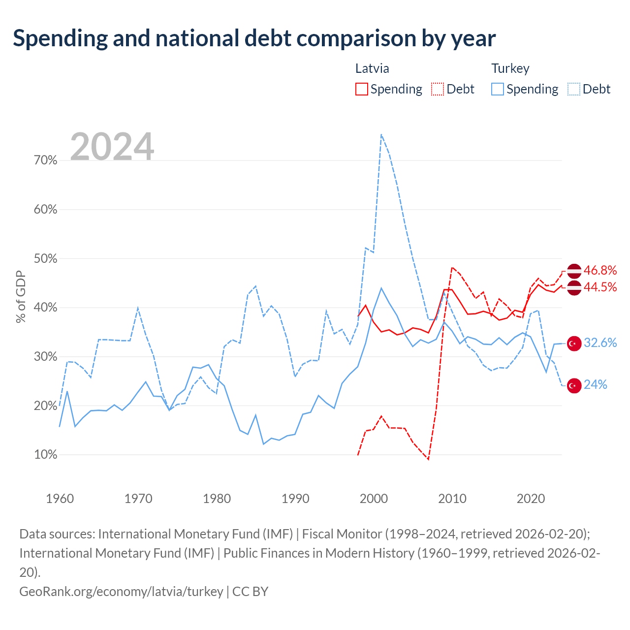 Latvia has $20.4B in government debt (46.8% of GDP), compared to $327B (24% of GDP) in Turkey.