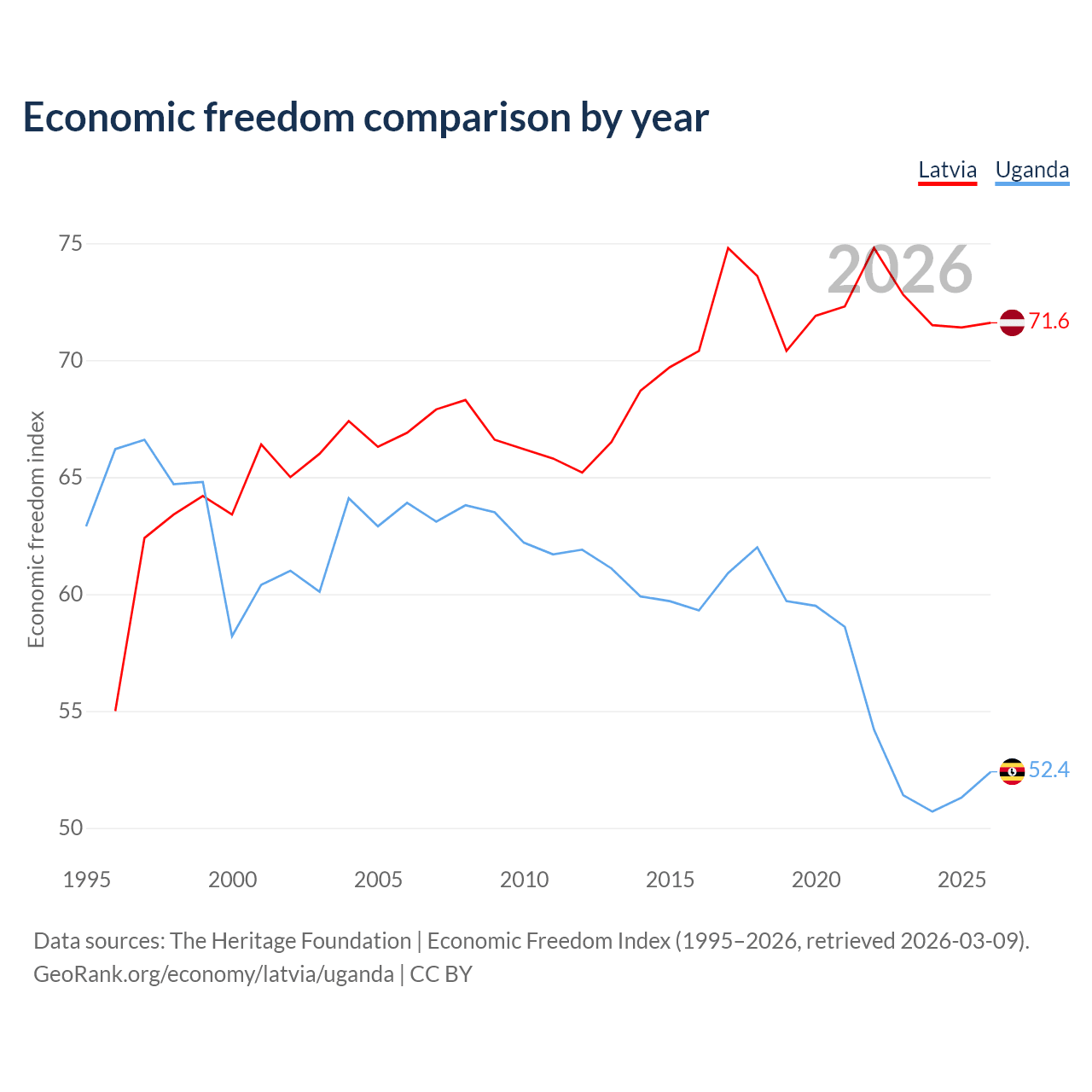 The Economic Freedom Index for Latvia is 71.6, ranking 31/197, compared to 52.4 for Uganda, ranking 149/197. The chart above displays a comparison of annual changes in economic freedom indexes.