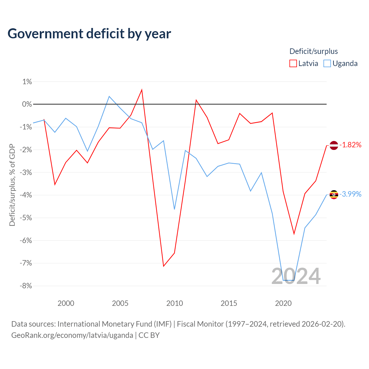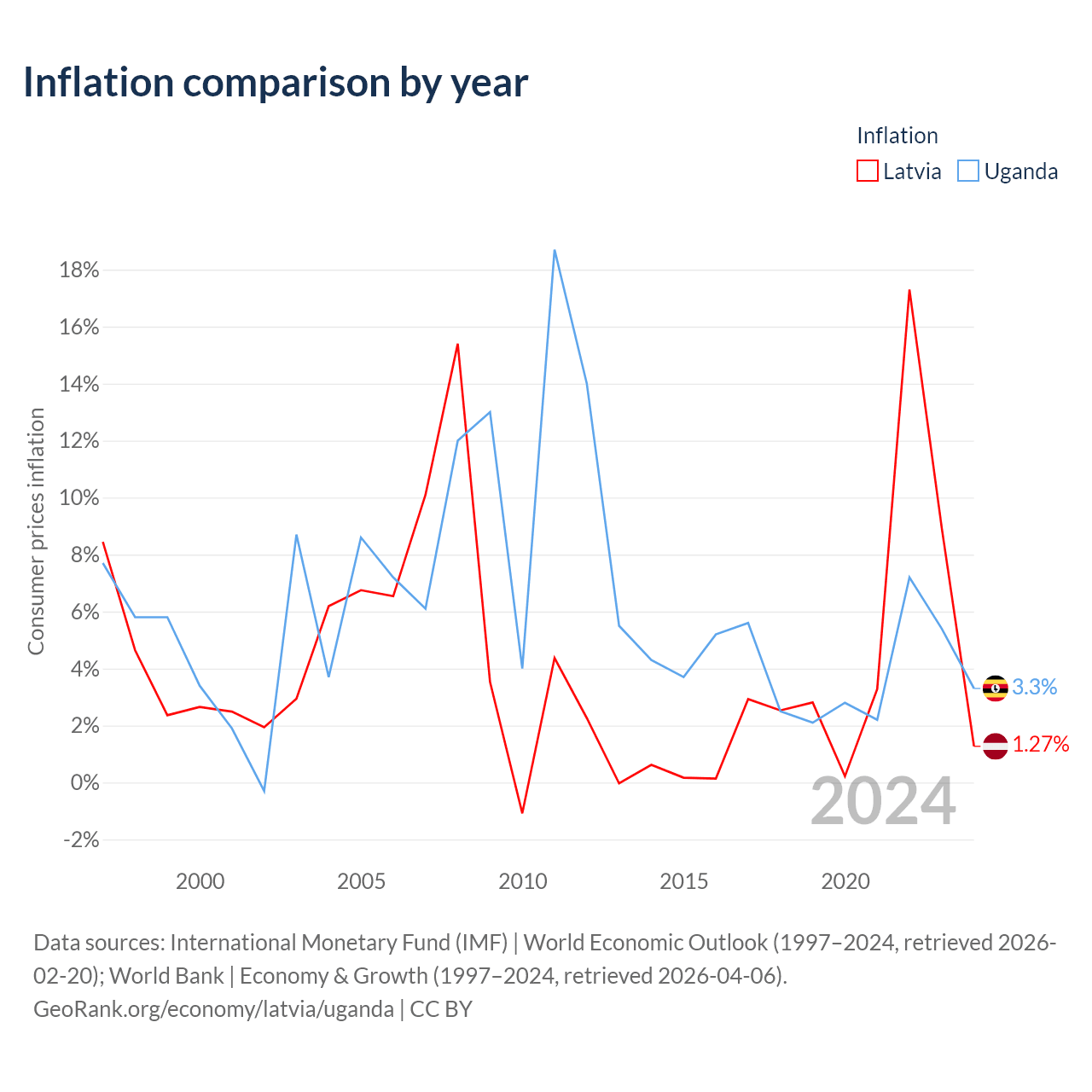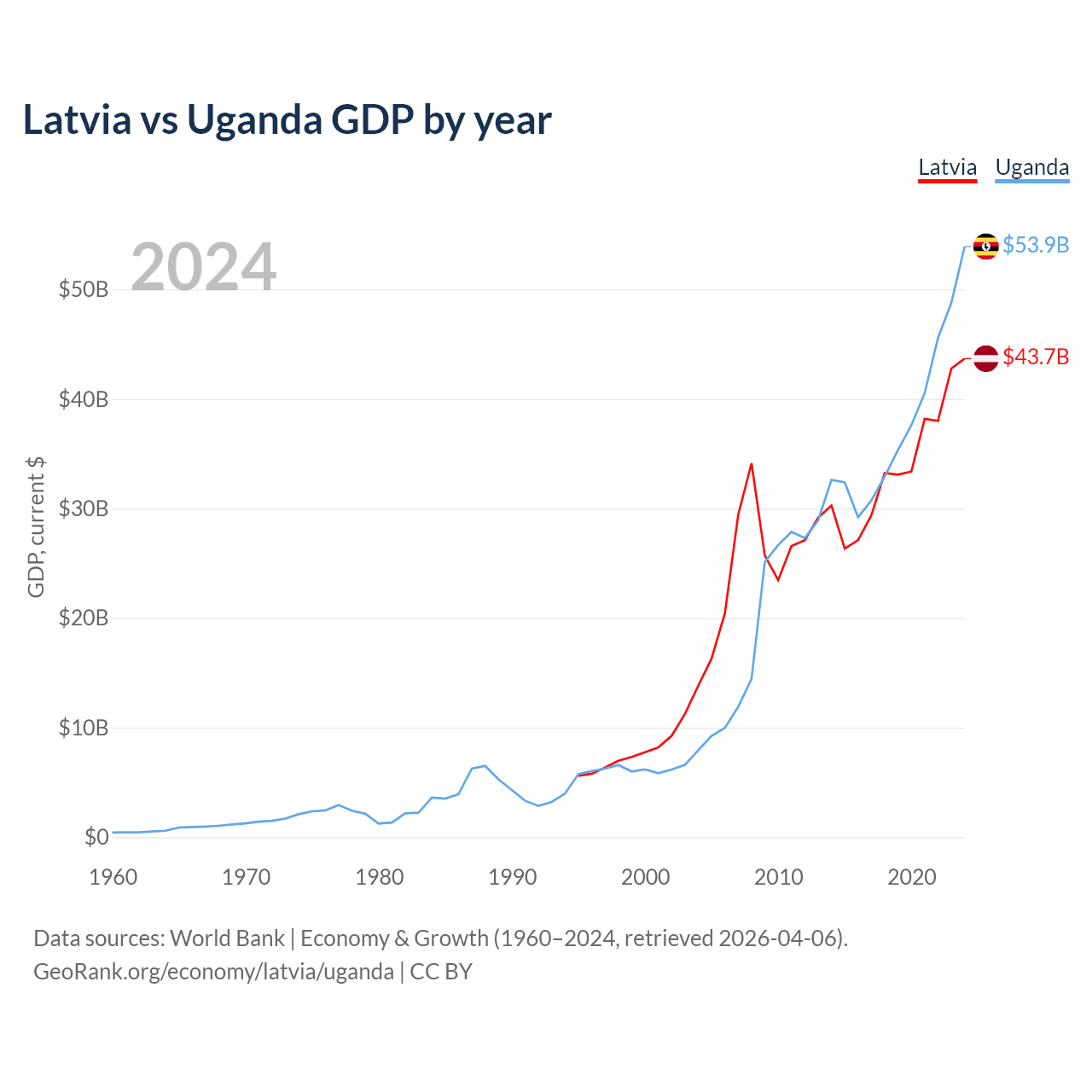 Latvia has a GDP of $43.7B compared to $53.9B for Uganda, ranking 99/197 and 89/197 by economy size, respectively.