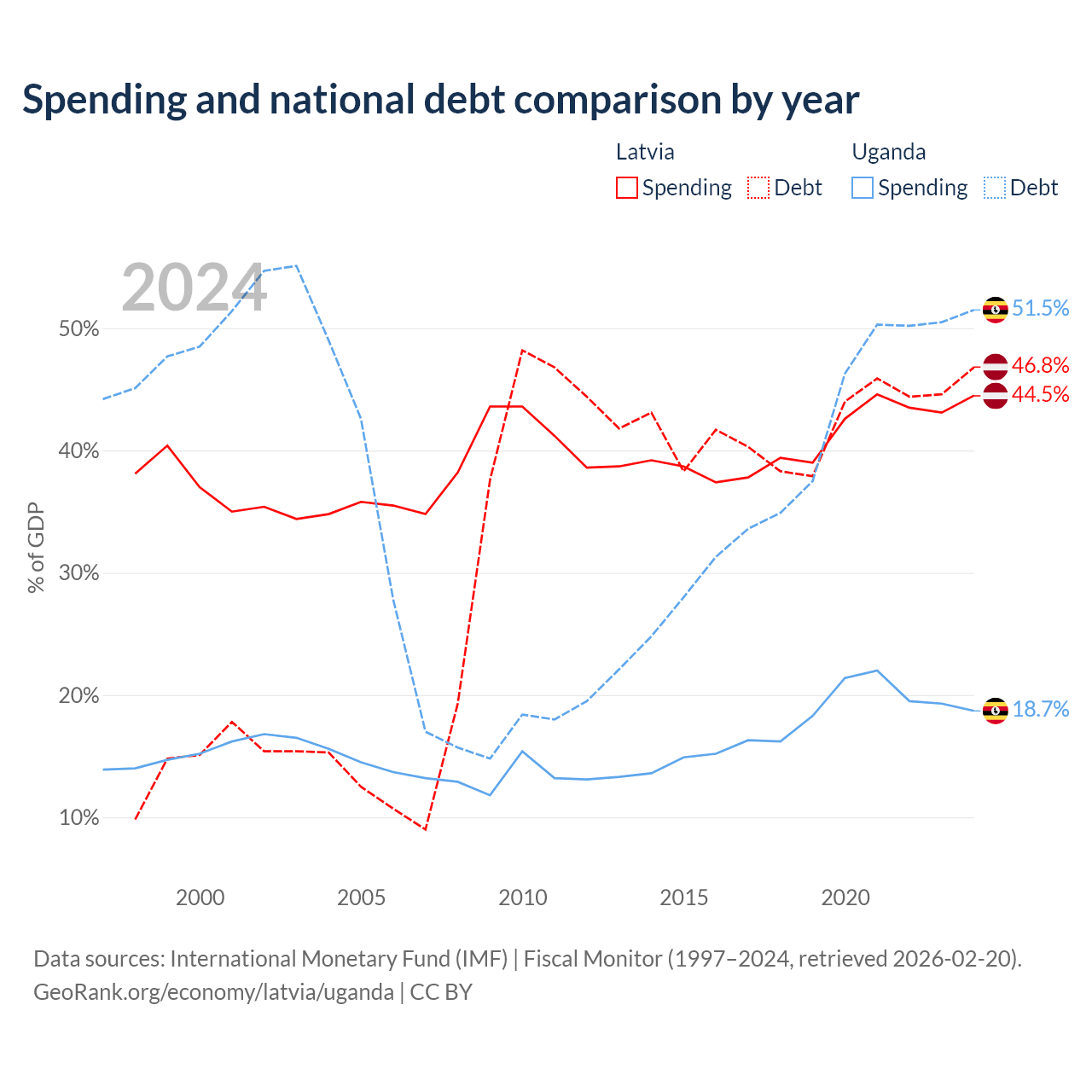 Latvia has $20.4B in government debt (46.8% of GDP), compared to $27.8B (51.5% of GDP) in Uganda.
