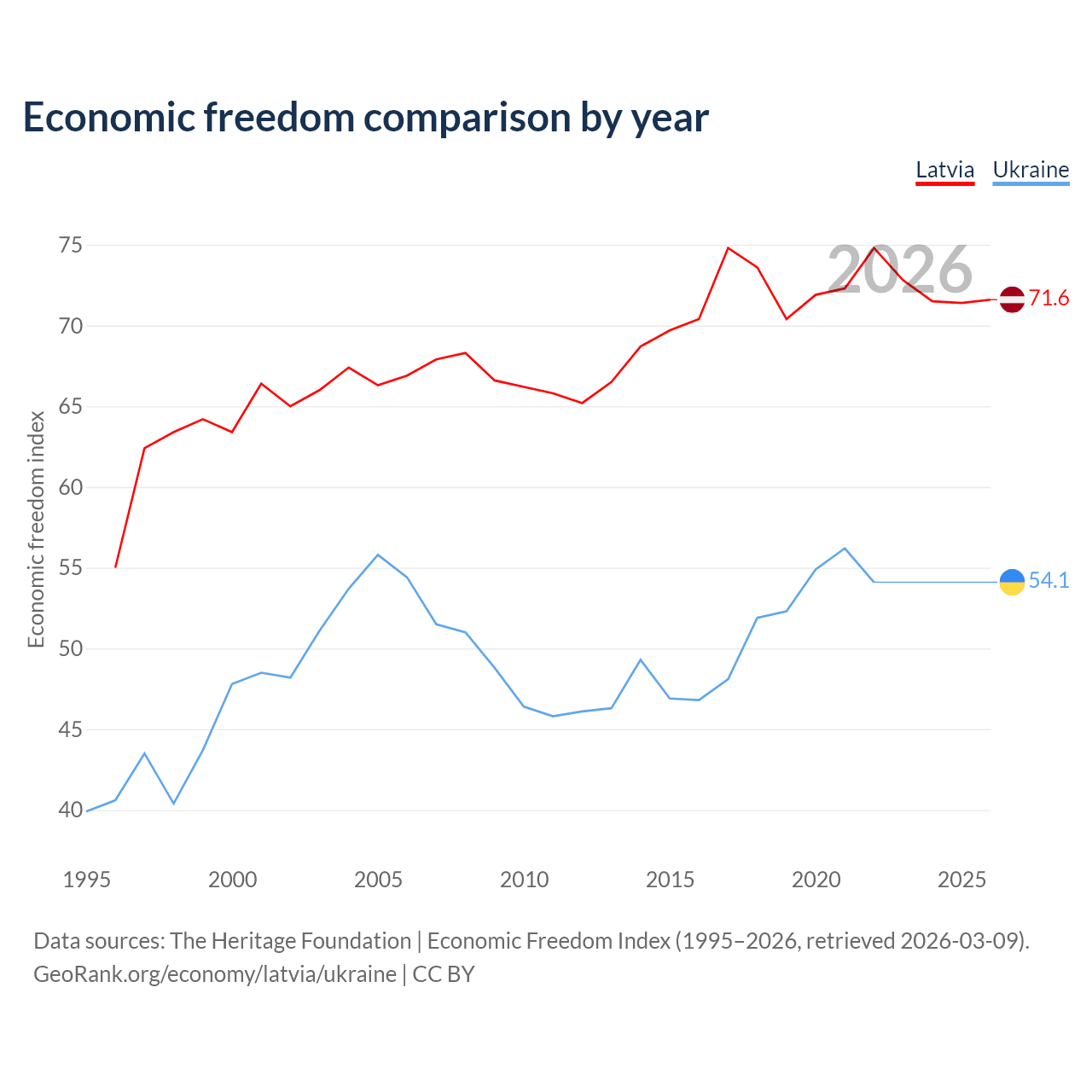 The Economic Freedom Index for Latvia is 71.6, ranking 31/197, compared to 54.1 for Ukraine, ranking 135/197. The chart above displays a comparison of annual changes in economic freedom indexes.