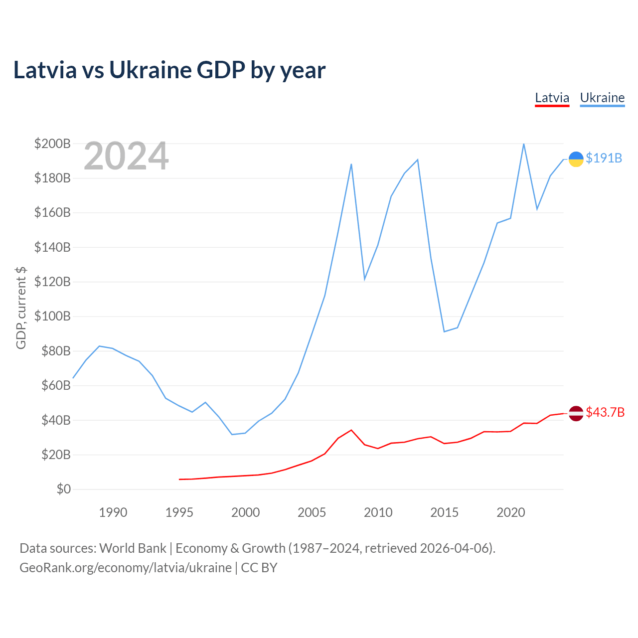 Latvia has a GDP of $43.7B compared to $191B for Ukraine, ranking 99/197 and 57/197 by economy size, respectively.
