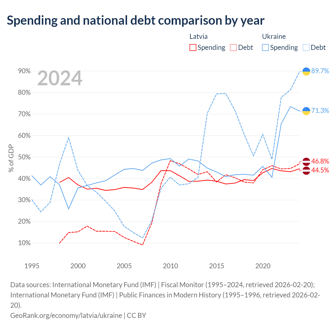 Latvia has $20.4B in government debt (46.8% of GDP), compared to $171B (89.7% of GDP) in Ukraine.
