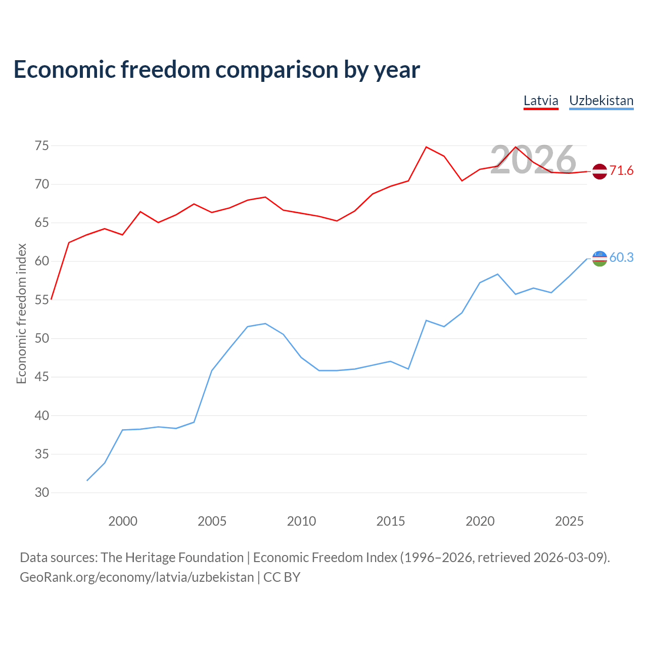 The Economic Freedom Index for Latvia is 71.6, ranking 31/197, compared to 60.3 for Uzbekistan, ranking 94/197. The chart above displays a comparison of annual changes in economic freedom indexes.
