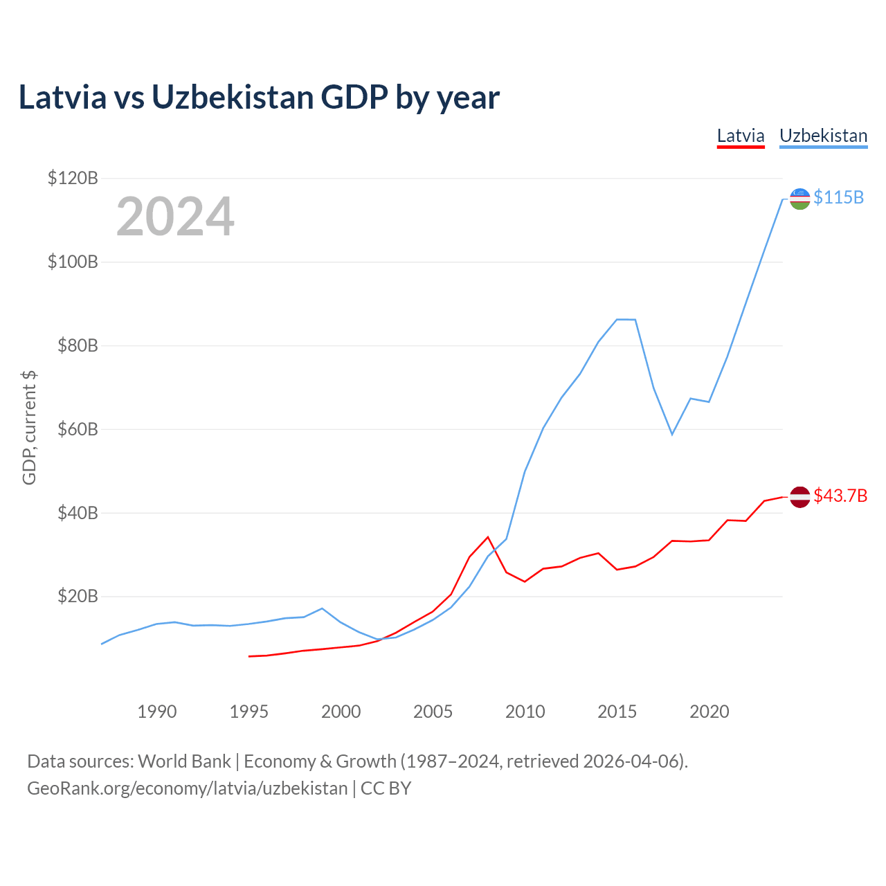Latvia has a GDP of $43.7B compared to $115B for Uzbekistan, ranking 99/197 and 66/197 by economy size, respectively.