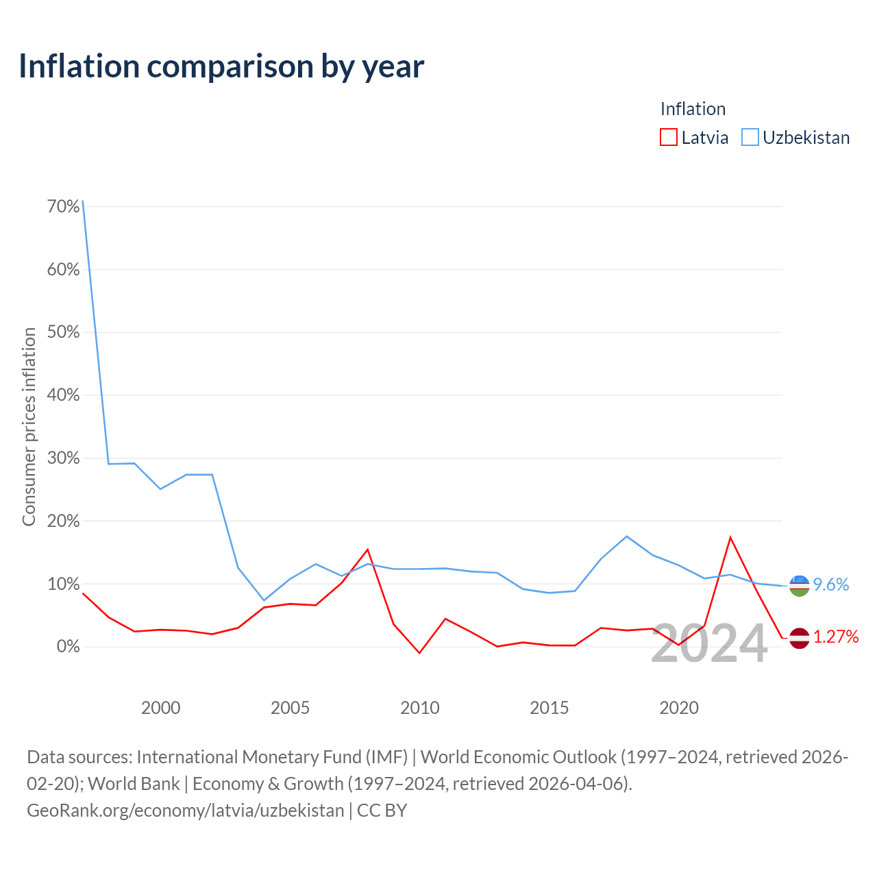 Latvia's GDP per capita is $23,409, ranking 54/197, compared to $3,162 in Uzbekistan, ranking 139/197. Adjusted for purchasing power (GDP per capita PPP), Latvia ranks 53rd at $43,394, while Uzbekistan ranks 125th at $11,879.