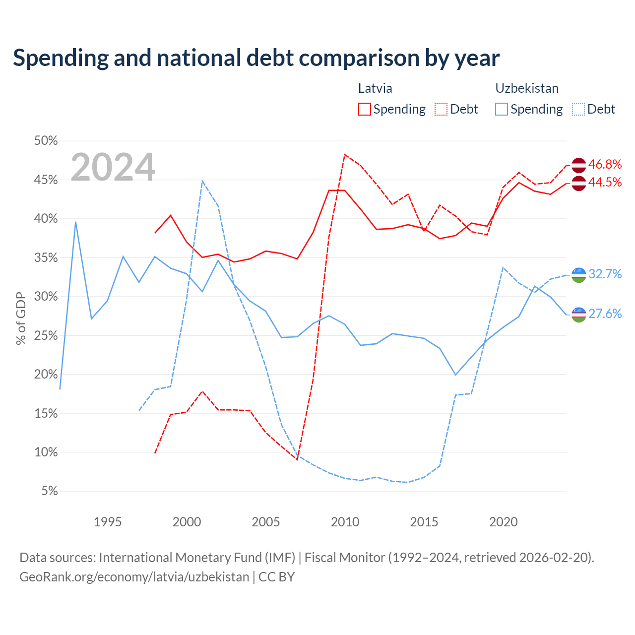 Latvia has $20.4B in government debt (46.8% of GDP), compared to $37.5B (32.7% of GDP) in Uzbekistan.