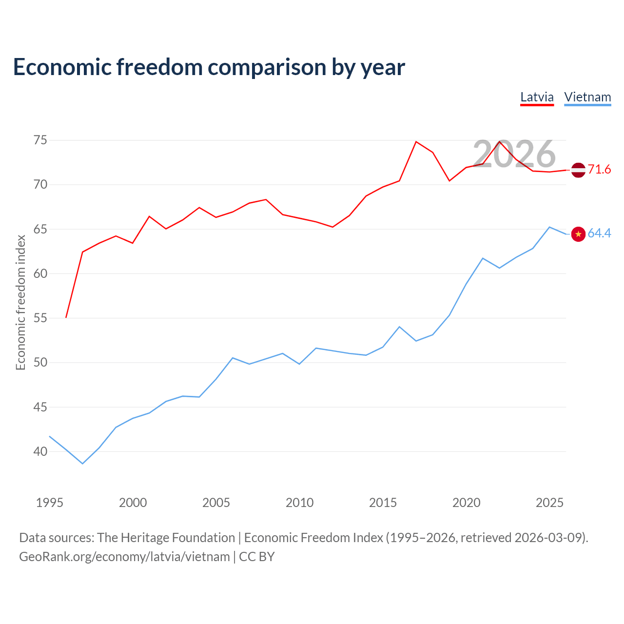 The Economic Freedom Index for Latvia is 71.6, ranking 31/197, compared to 64.4 for Vietnam, ranking 73/197. The chart above displays a comparison of annual changes in economic freedom indexes.