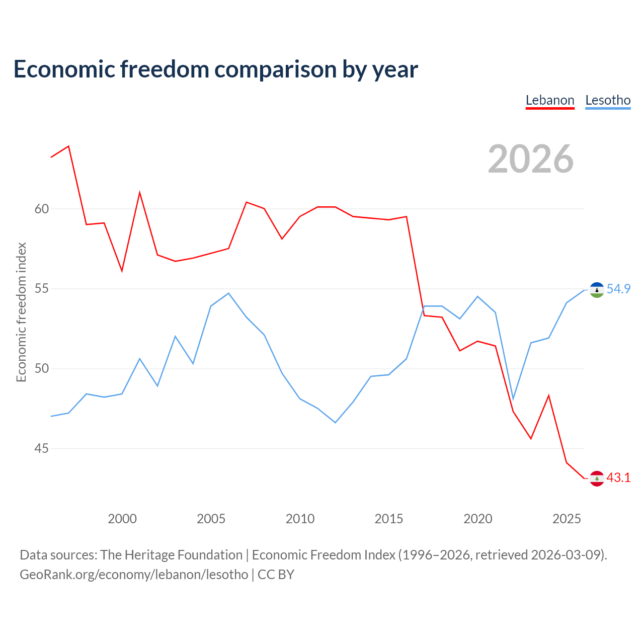 The Economic Freedom Index for Lebanon is 43.1, ranking 183/197, compared to 54.9 for Lesotho, ranking 130/197. The chart above displays a comparison of annual changes in economic freedom indexes.