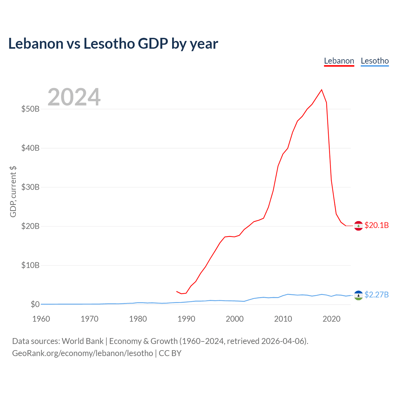 Lebanon has a GDP of $20.1B compared to $2.27B for Lesotho, ranking 128/197 and 175/197 by economy size, respectively.
