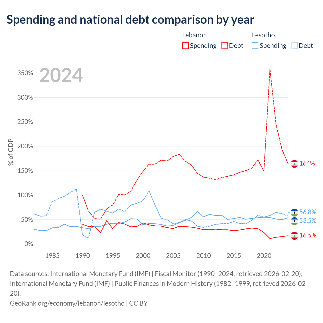 Lebanon has $38.7B in government debt (163.8% of GDP), compared to $1.29B (56.8% of GDP) in Lesotho.