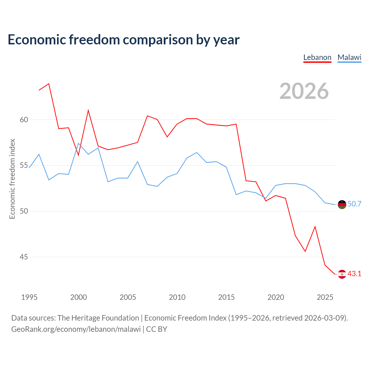 The Economic Freedom Index for Lebanon is 43.1, ranking 183/197, compared to 50.7 for Malawi, ranking 159/197. The chart above displays a comparison of annual changes in economic freedom indexes.