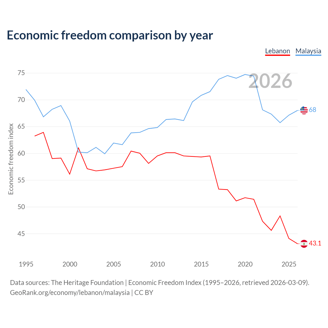 The Economic Freedom Index for Lebanon is 43.1, ranking 183/197, compared to 68 for Malaysia, ranking 51/197. The chart above displays a comparison of annual changes in economic freedom indexes.