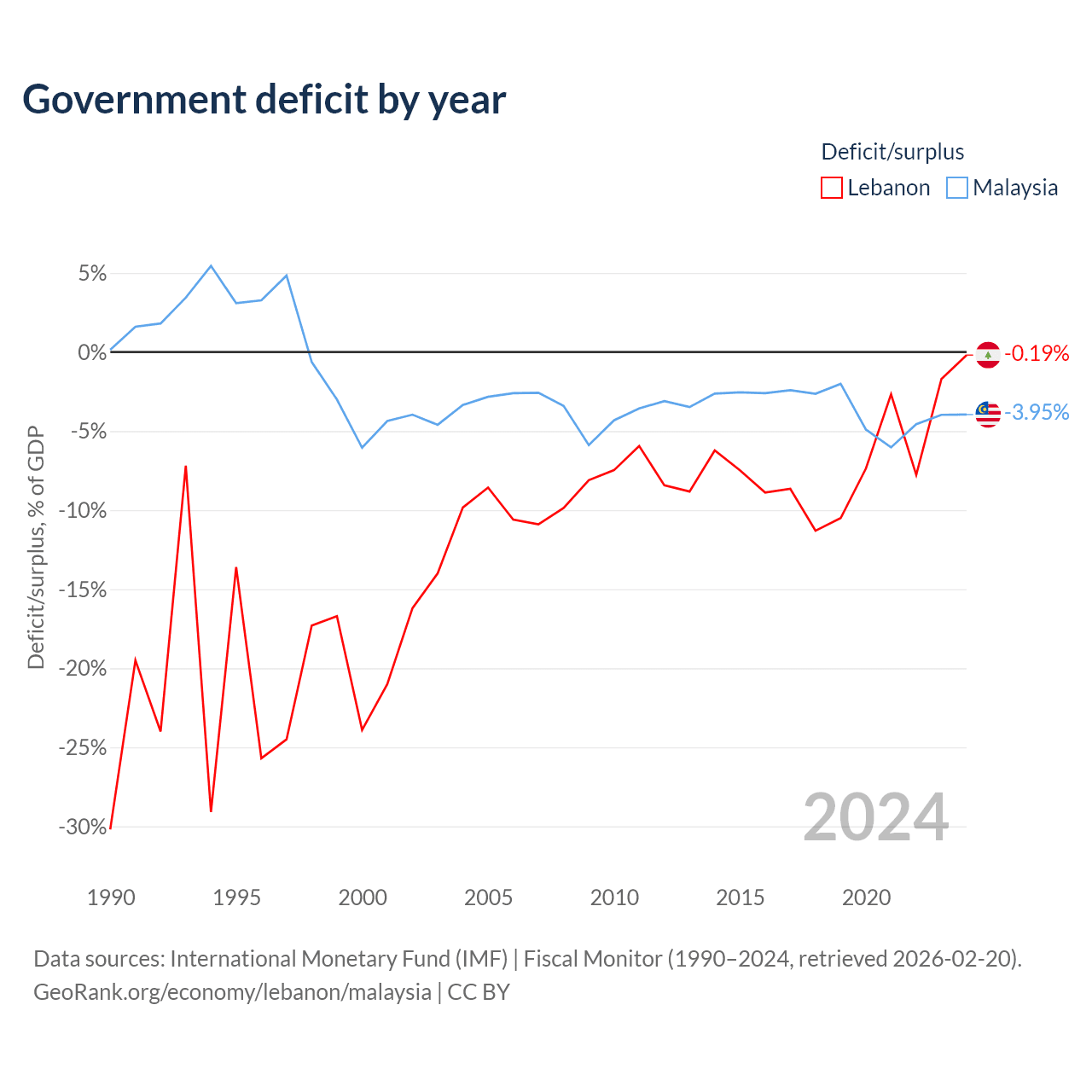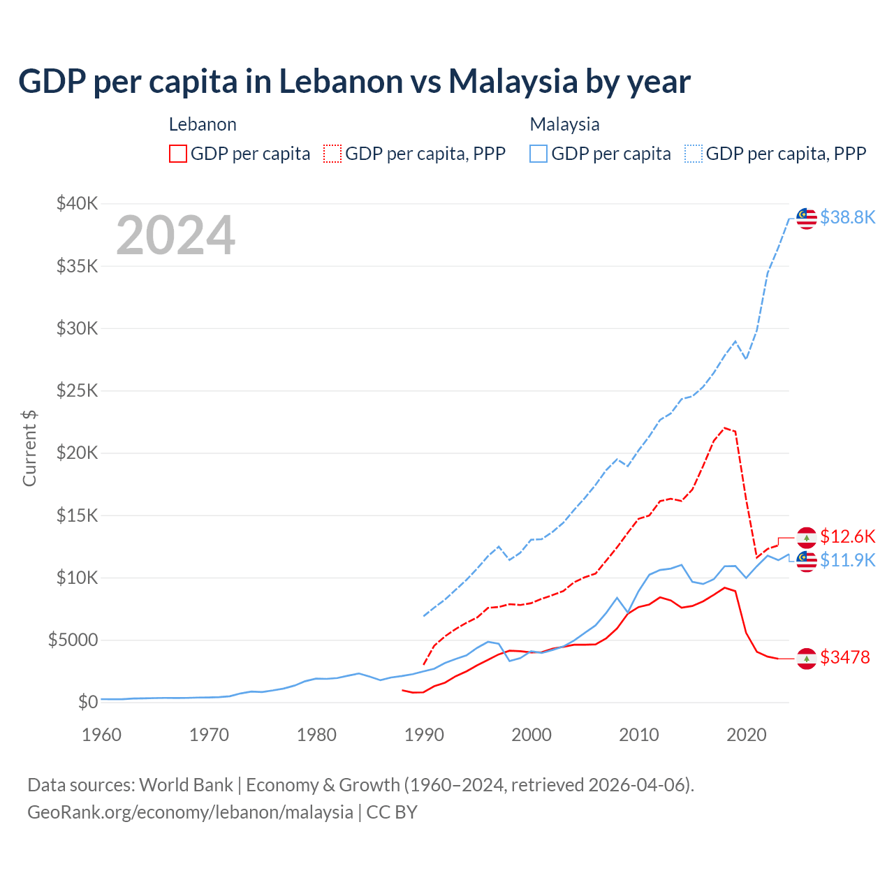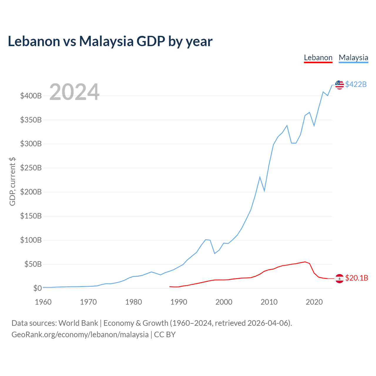 Lebanon has a GDP of $20.1B compared to $422B for Malaysia, ranking 128/197 and 38/197 by economy size, respectively.