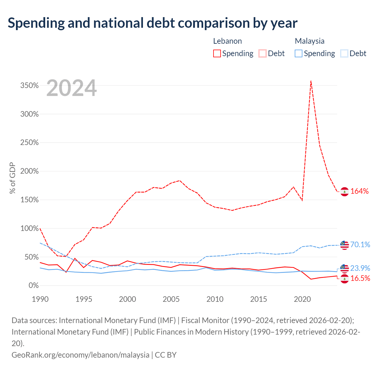 Lebanon has $38.7B in government debt (163.8% of GDP), compared to $296B (70.1% of GDP) in Malaysia.