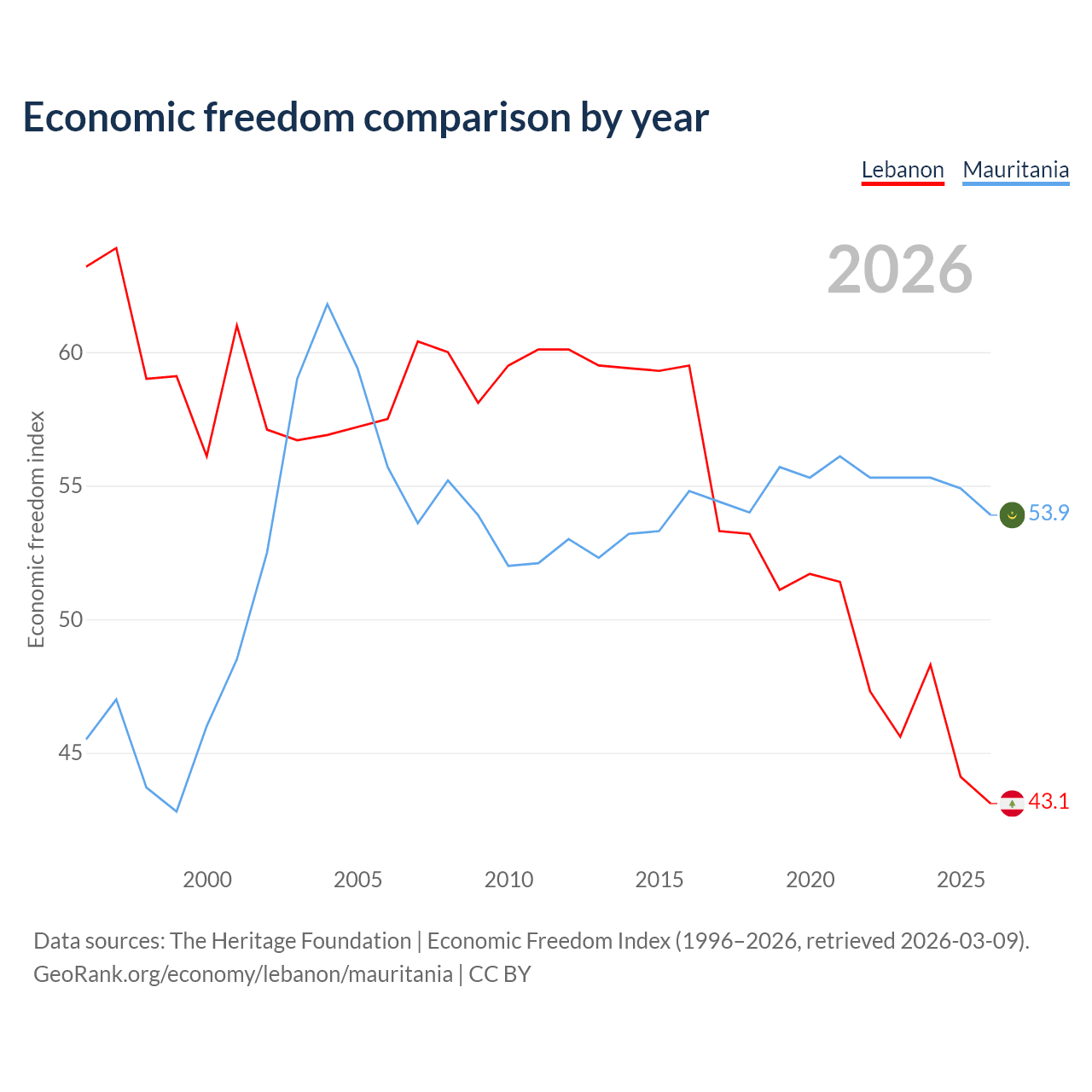 The Economic Freedom Index for Lebanon is 43.1, ranking 183/197, compared to 53.9 for Mauritania, ranking 136/197. The chart above displays a comparison of annual changes in economic freedom indexes.