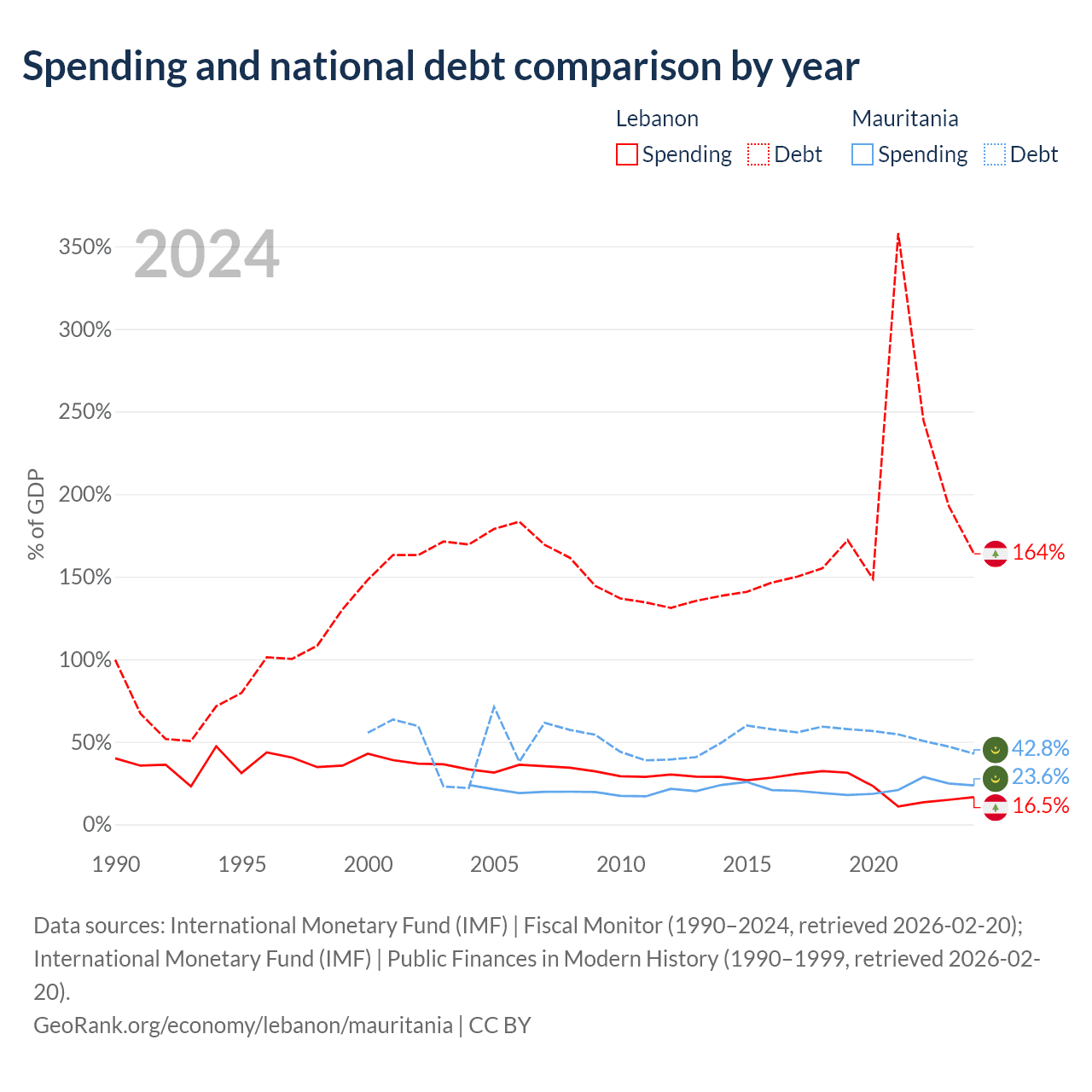 Lebanon has $38.7B in government debt (163.8% of GDP), compared to $4.67B (42.8% of GDP) in Mauritania.