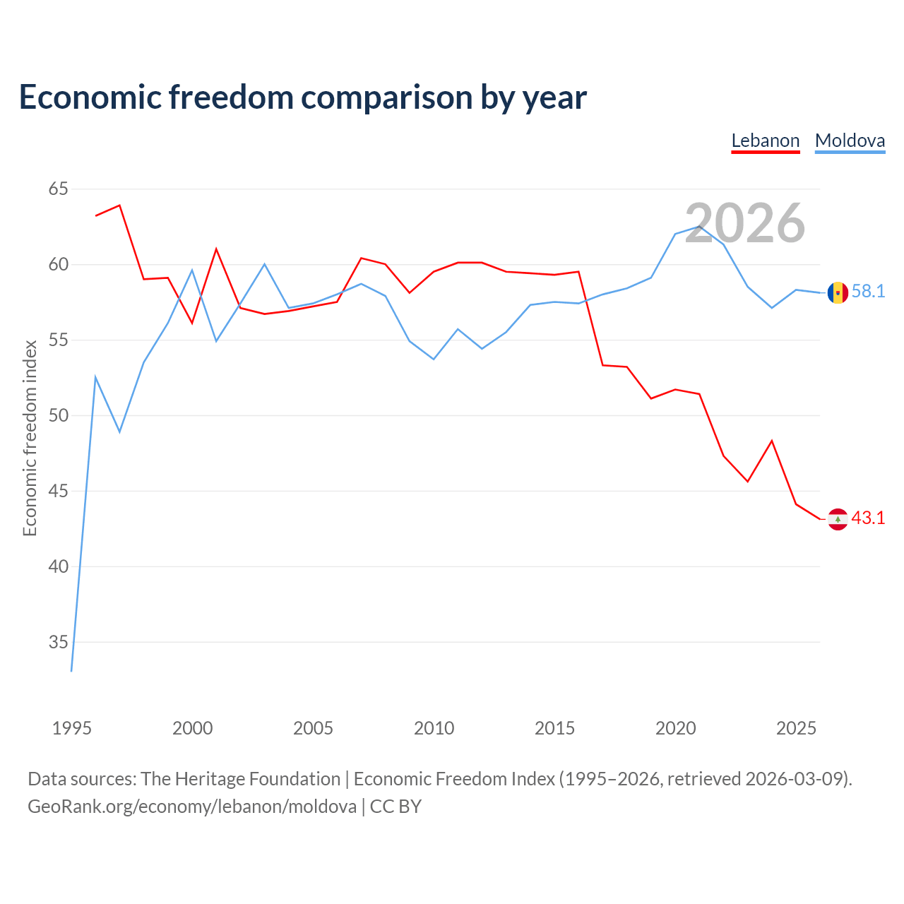 The Economic Freedom Index for Lebanon is 43.1, ranking 183/197, compared to 58.1 for Moldova, ranking 112/197. The chart above displays a comparison of annual changes in economic freedom indexes.