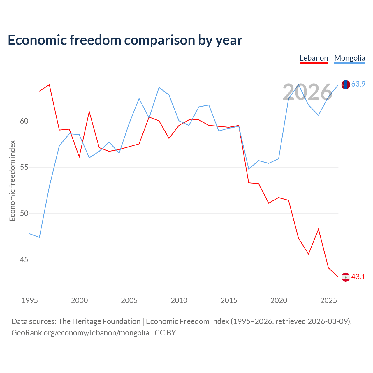 The Economic Freedom Index for Lebanon is 43.1, ranking 183/197, compared to 63.9 for Mongolia, ranking 76/197. The chart above displays a comparison of annual changes in economic freedom indexes.