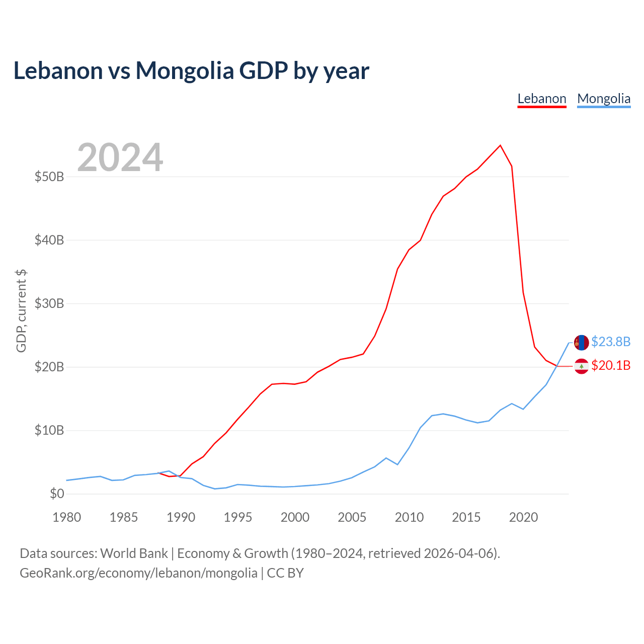 Lebanon has a GDP of $20.1B compared to $23.8B for Mongolia, ranking 128/197 and 121/197 by economy size, respectively.