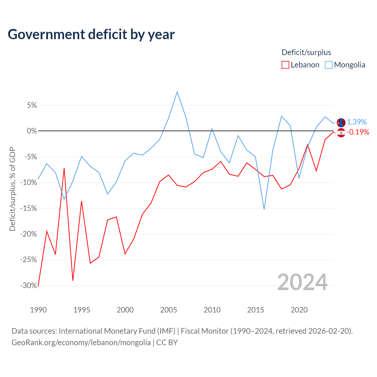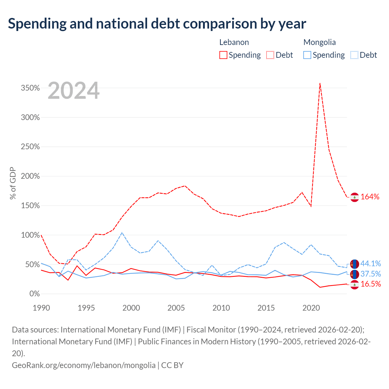 Lebanon has $38.7B in government debt (163.8% of GDP), compared to $10.5B (44.1% of GDP) in Mongolia.