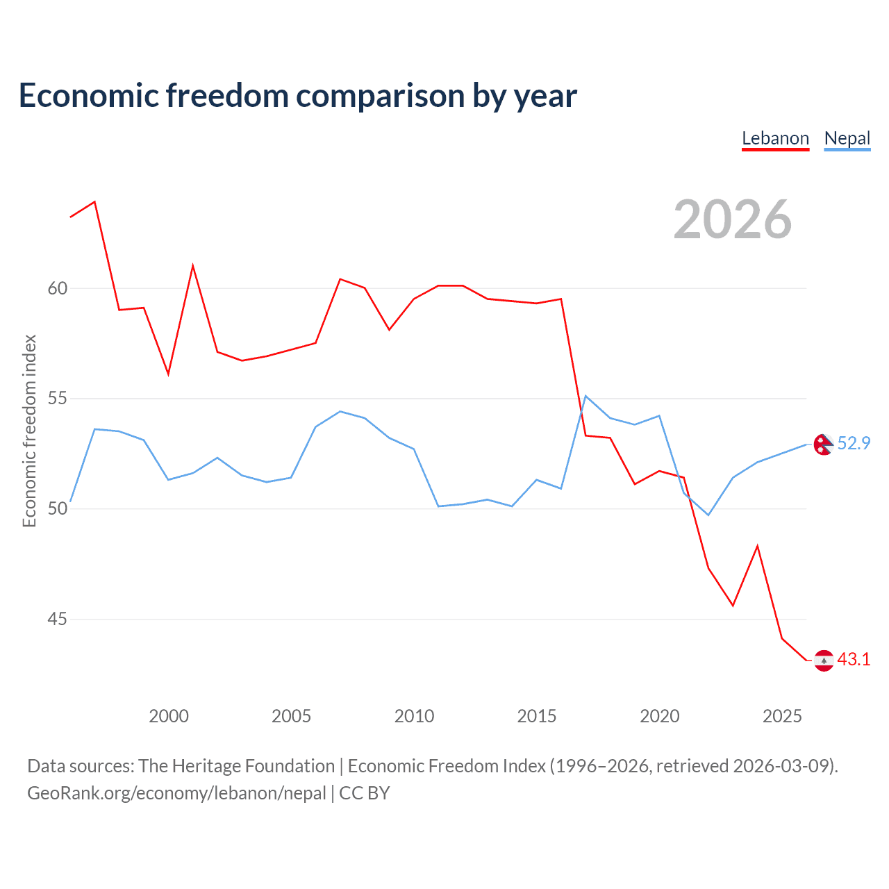 The Economic Freedom Index for Lebanon is 43.1, ranking 183/197, compared to 52.9 for Nepal, ranking 144/197. The chart above displays a comparison of annual changes in economic freedom indexes.