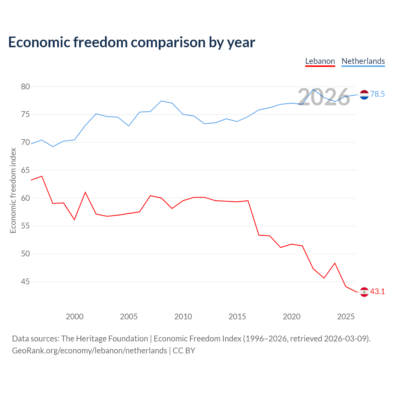 The Economic Freedom Index for Lebanon is 43.1, ranking 183/197, compared to 78.5 for the Netherlands, ranking 11/197. The chart above displays a comparison of annual changes in economic freedom indexes.