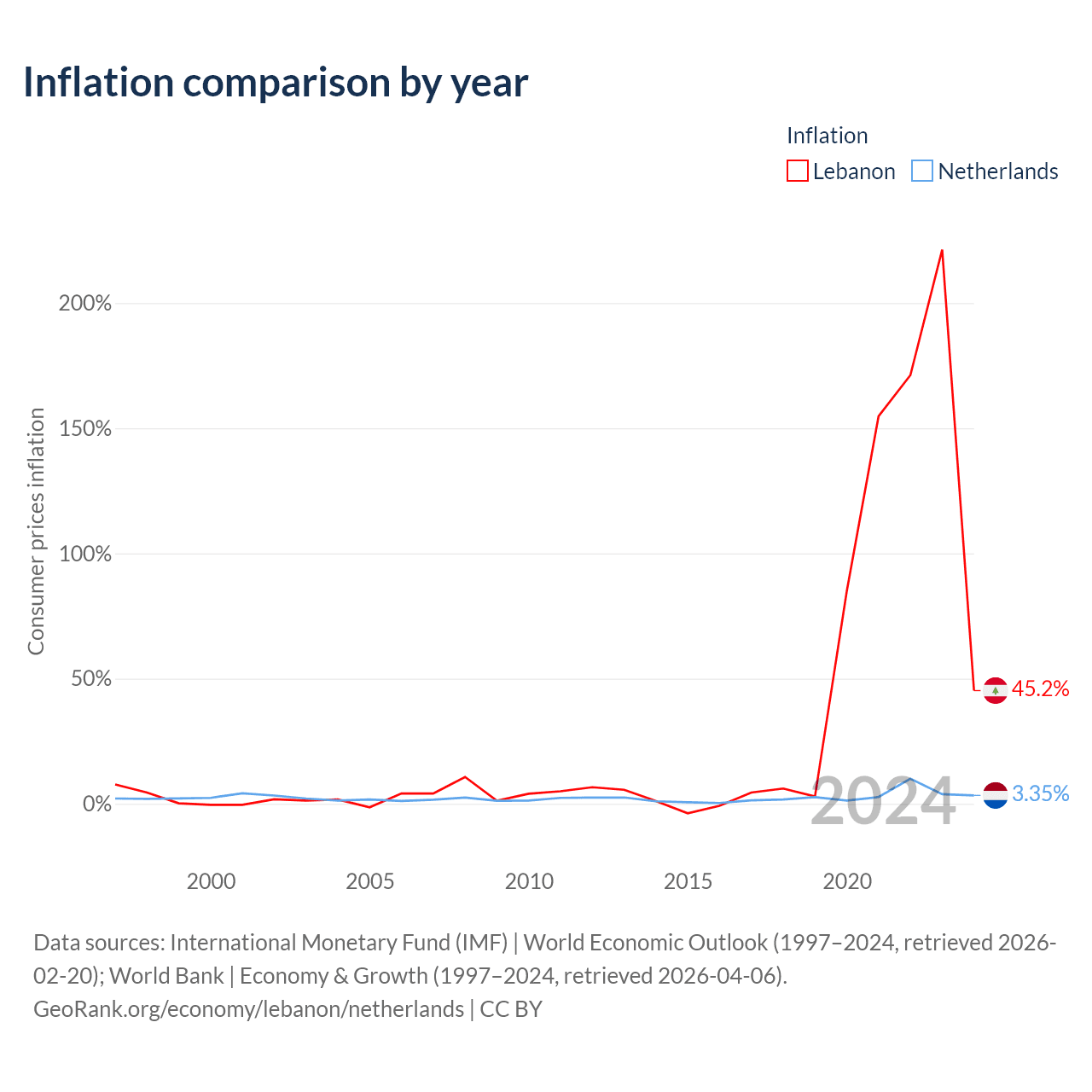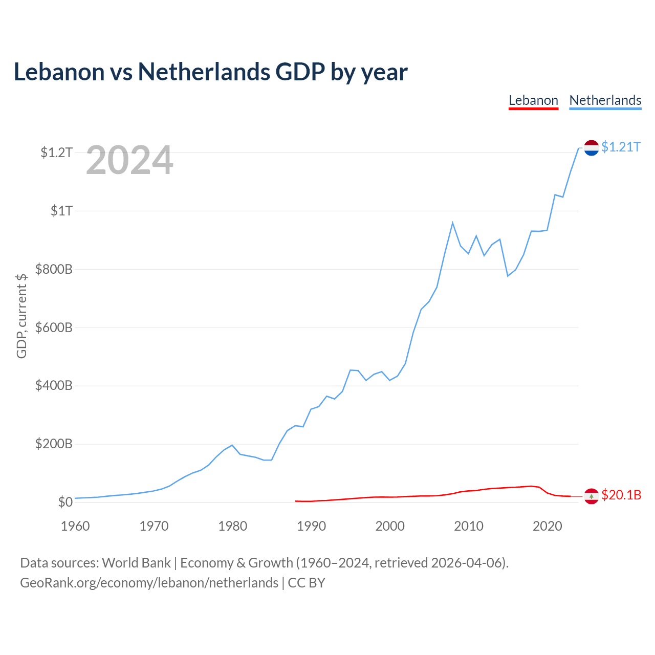 Lebanon has a GDP of $20.1B compared to $1.21T for the Netherlands, ranking 128/197 and 19/197 by economy size, respectively.