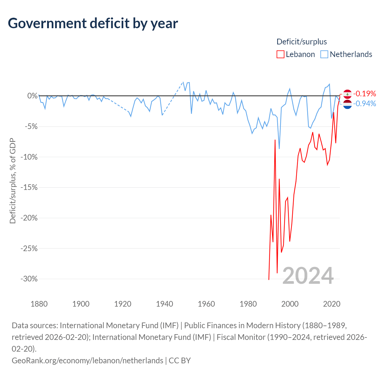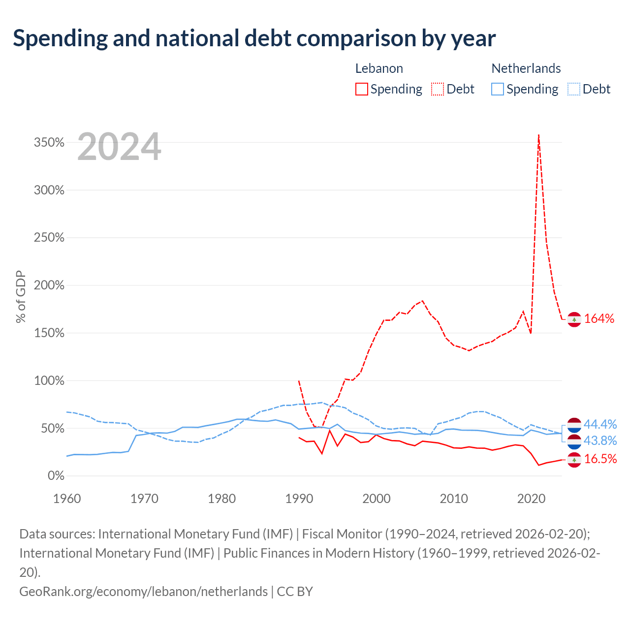 Lebanon has $38.7B in government debt (163.8% of GDP), compared to $532B (43.8% of GDP) in the Netherlands.