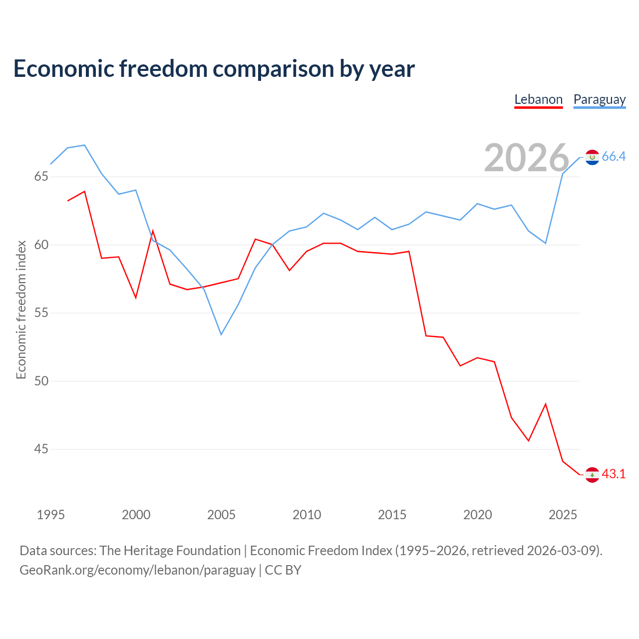 The Economic Freedom Index for Lebanon is 43.1, ranking 183/197, compared to 66.4 for Paraguay, ranking 61/197. The chart above displays a comparison of annual changes in economic freedom indexes.