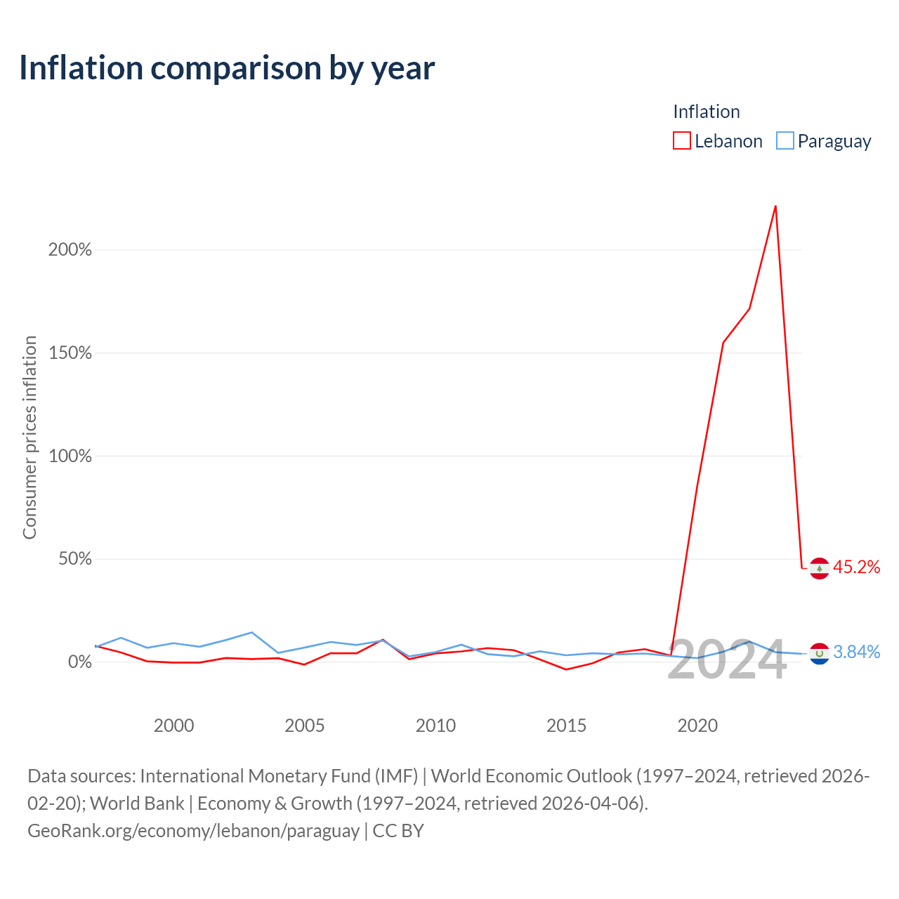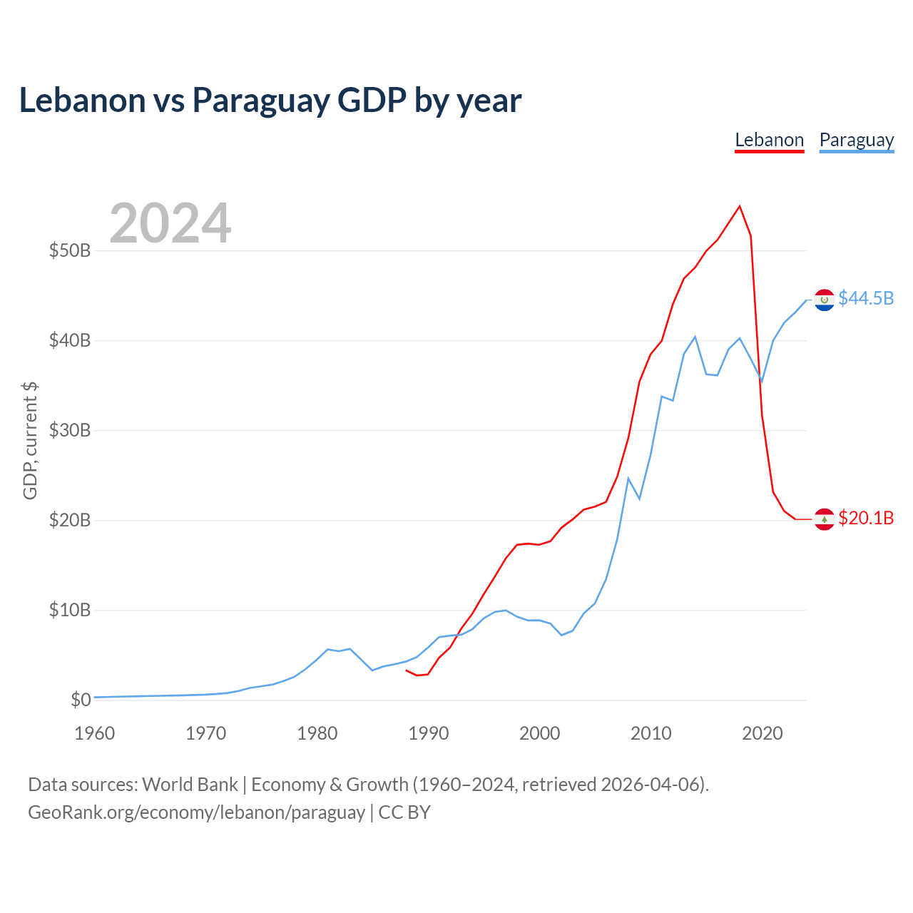 Lebanon has a GDP of $20.1B compared to $44.5B for Paraguay, ranking 128/197 and 98/197 by economy size, respectively.
