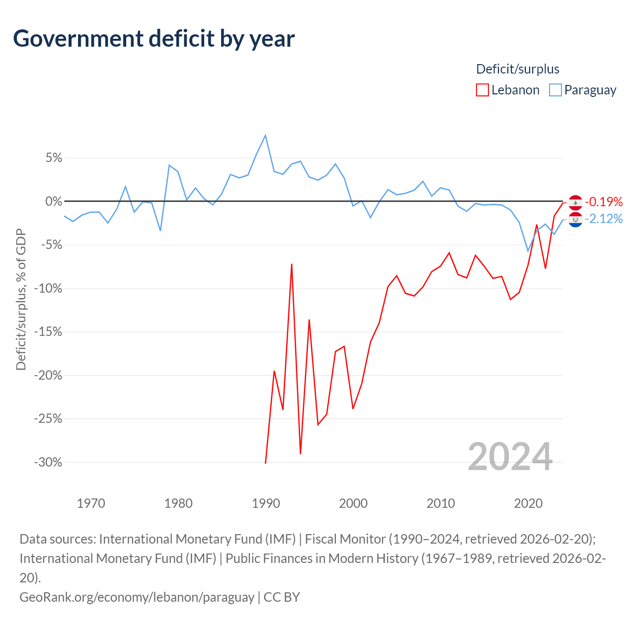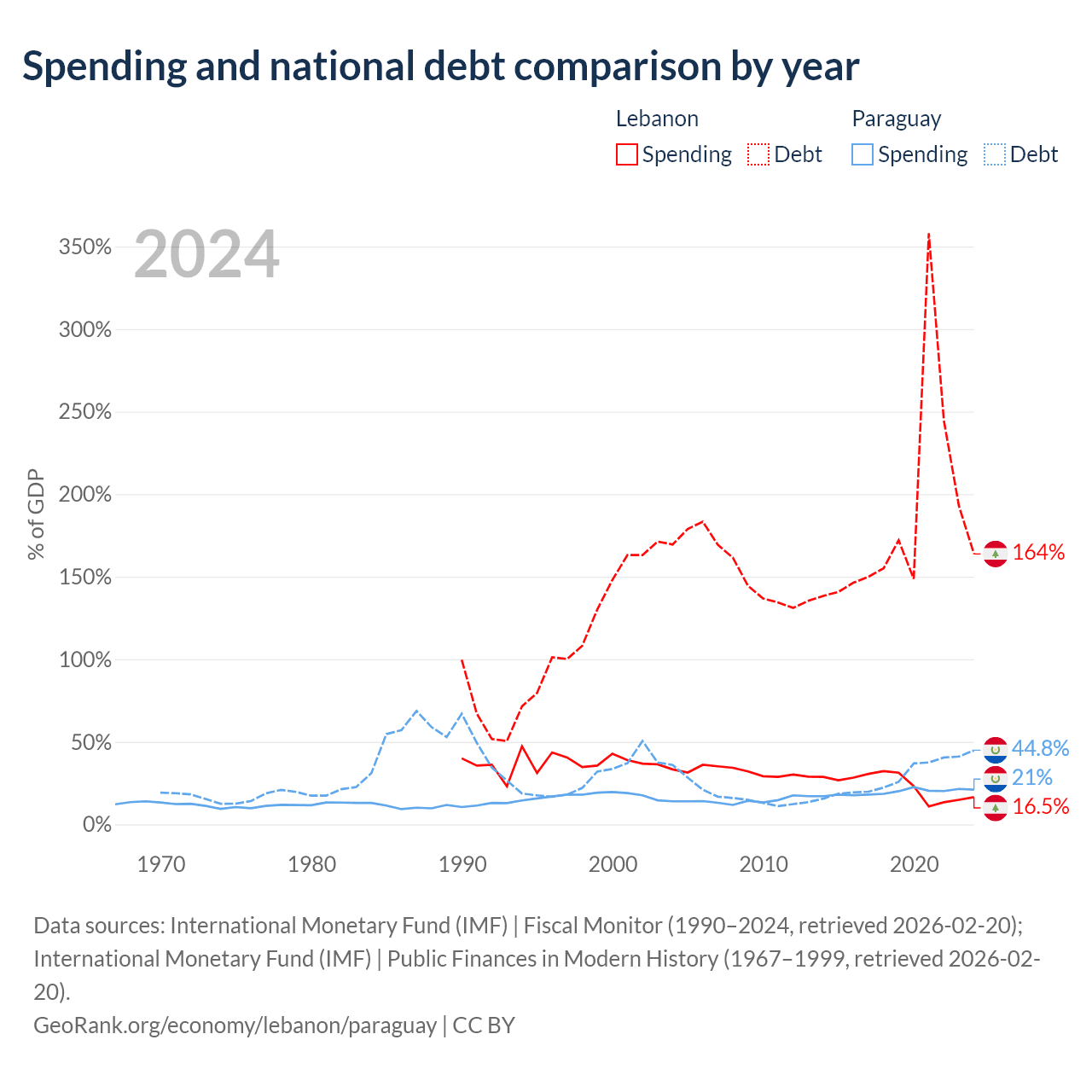 Lebanon has $38.7B in government debt (163.8% of GDP), compared to $19.9B (44.8% of GDP) in Paraguay.