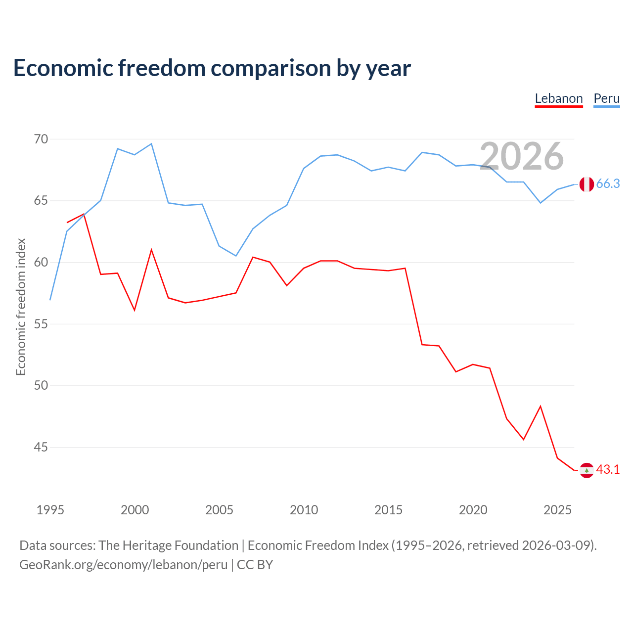 The Economic Freedom Index for Lebanon is 43.1, ranking 183/197, compared to 66.3 for Peru, ranking 62/197. The chart above displays a comparison of annual changes in economic freedom indexes.