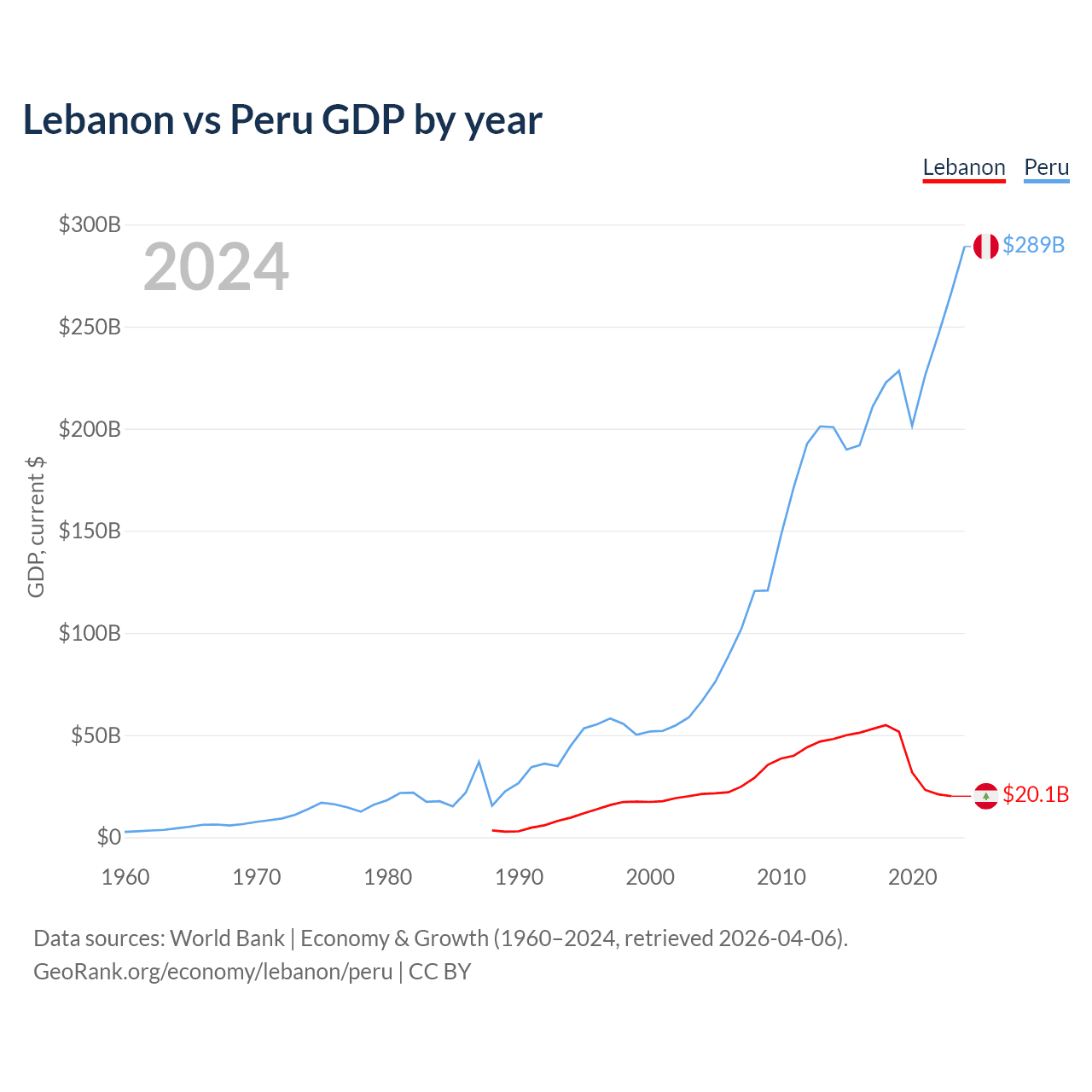 Lebanon has a GDP of $20.1B compared to $289B for Peru, ranking 128/197 and 49/197 by economy size, respectively.