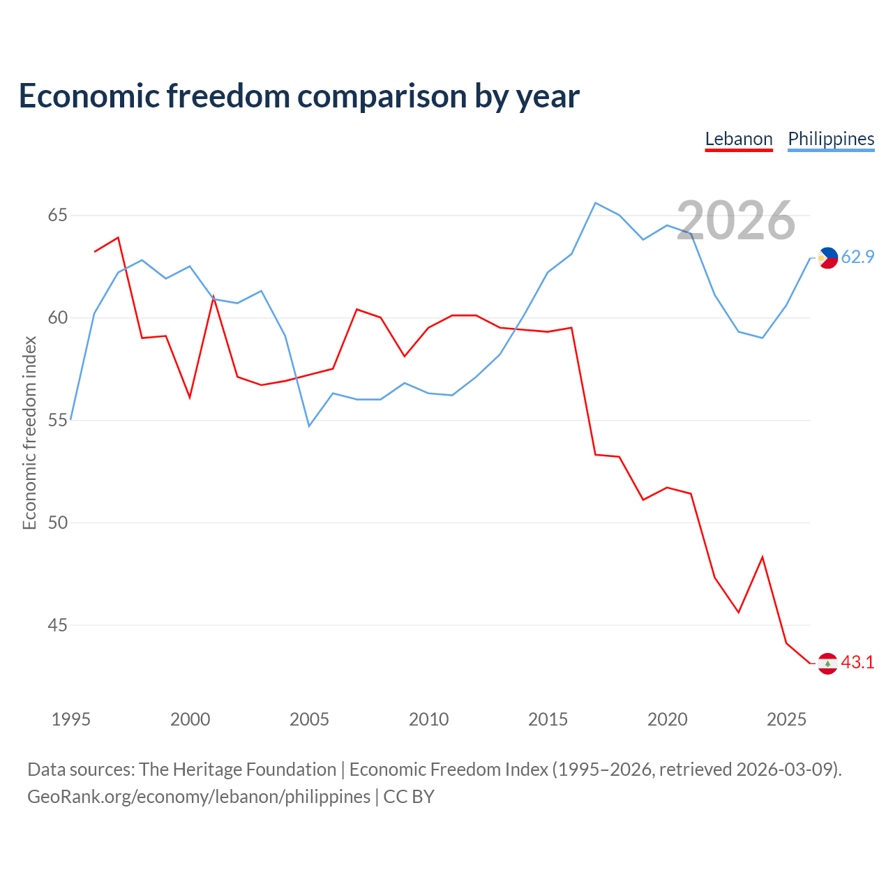 The Economic Freedom Index for Lebanon is 43.1, ranking 183/197, compared to 62.9 for the Philippines, ranking 85/197. The chart above displays a comparison of annual changes in economic freedom indexes.
