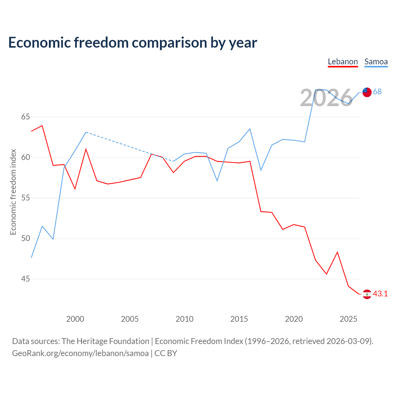 The Economic Freedom Index for Lebanon is 43.1, ranking 183/197, compared to 68 for Samoa, ranking 52/197. The chart above displays a comparison of annual changes in economic freedom indexes.