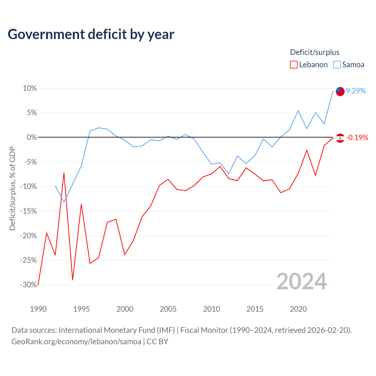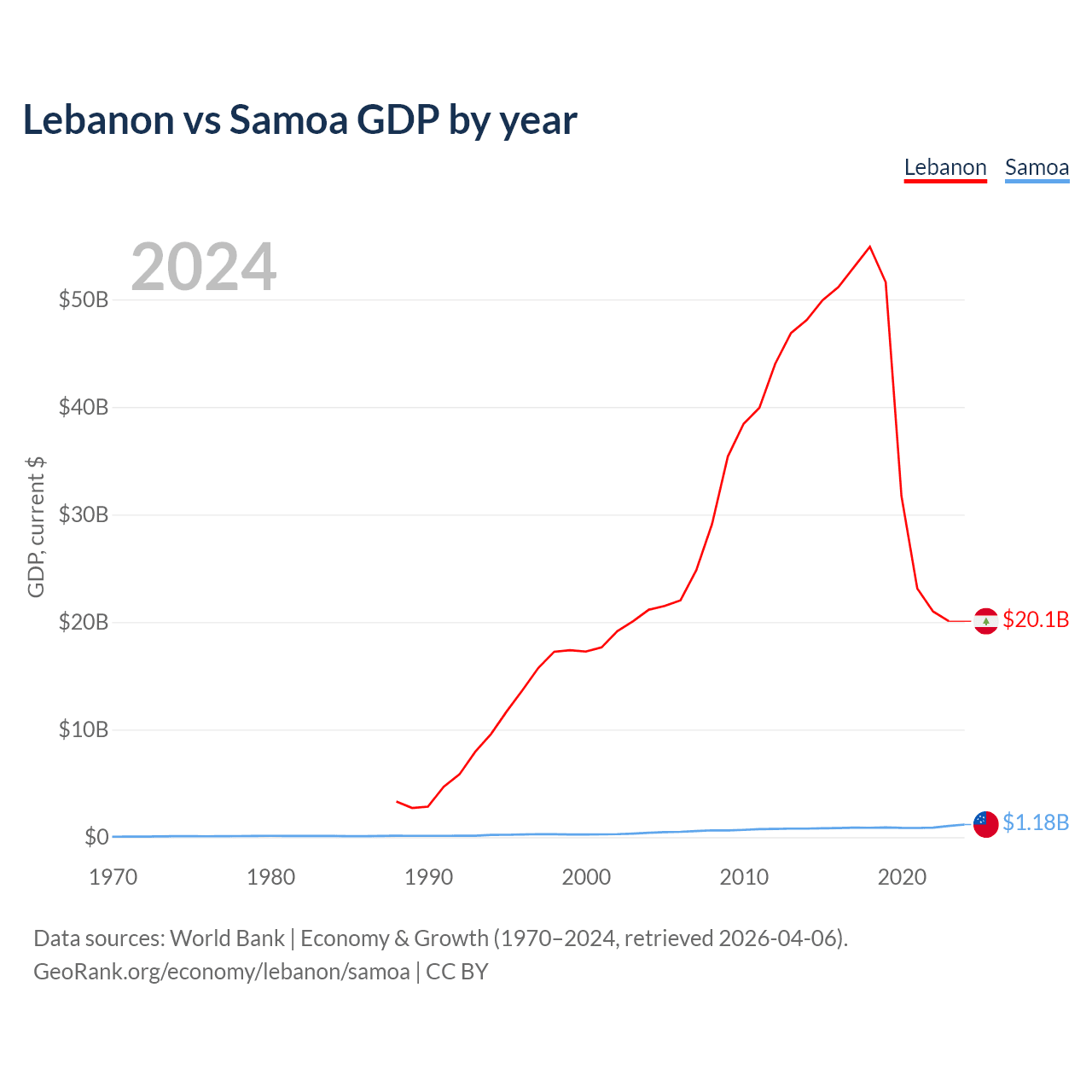 Lebanon has a GDP of $20.1B compared to $1.18B for Samoa, ranking 128/197 and 185/197 by economy size, respectively.